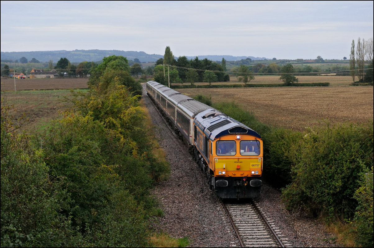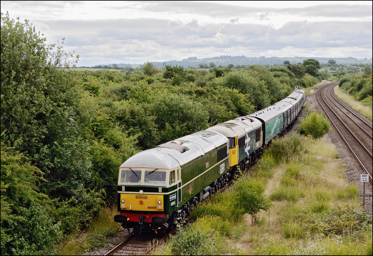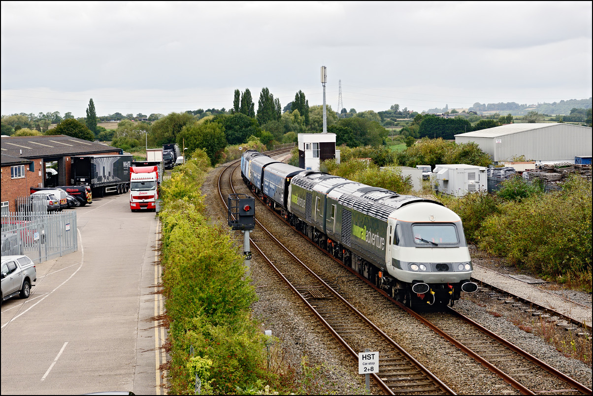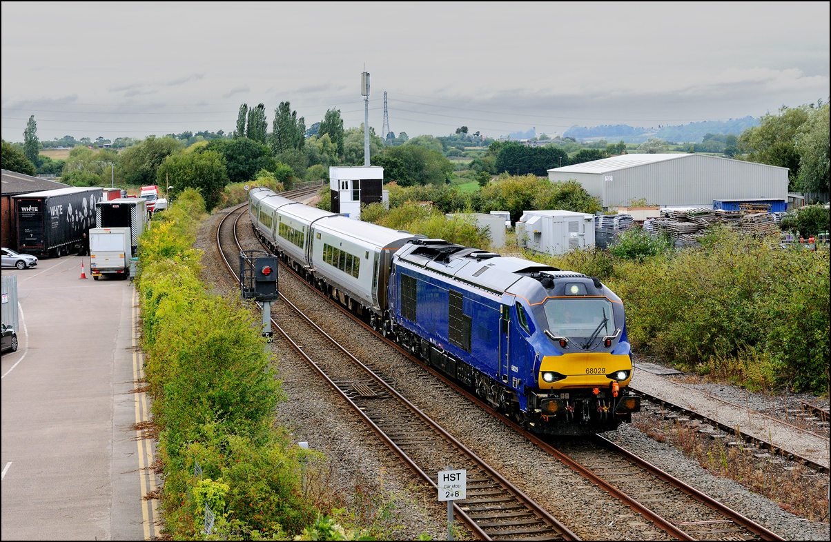 Another Trans-Pennine coaching set was due to be taken from Longsight to Long Marston on 27 August 2024. Unusually, it wasn't cancelled and the unbranded set left Manchester a few minutes late with 68029, also now without the attractive TP colour scheme. The sun was out at home and the sky in the Evesham direction looked to be clearing so I made a late decision to drive over and arrived about 2 minutes before 5Q94 appeared and, and as it turned out, probably about 30 minutes before the sun came out. |