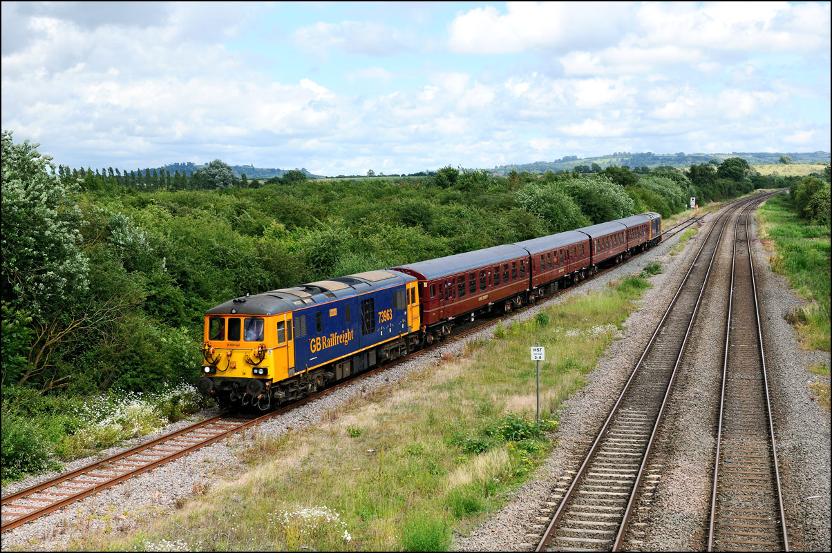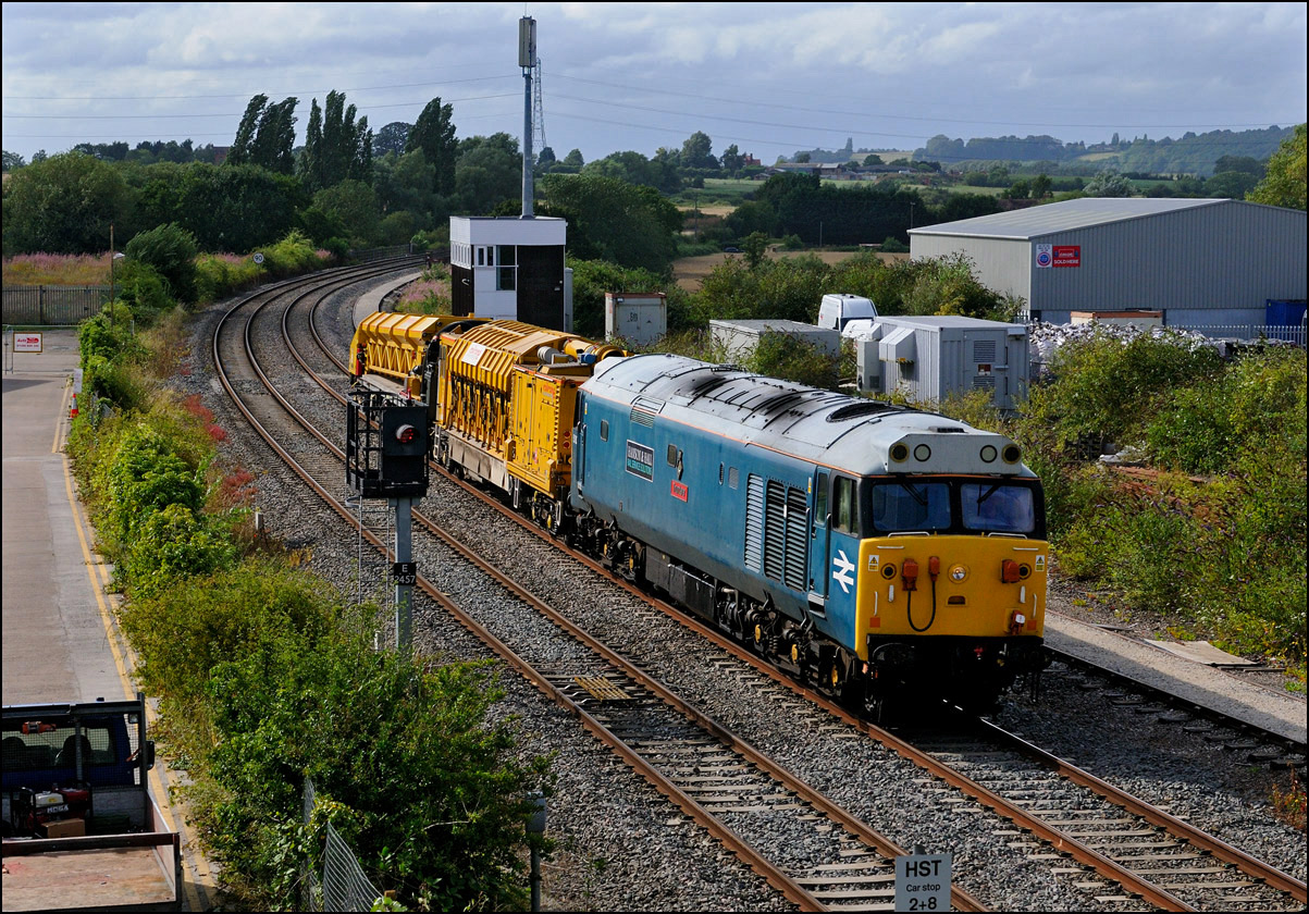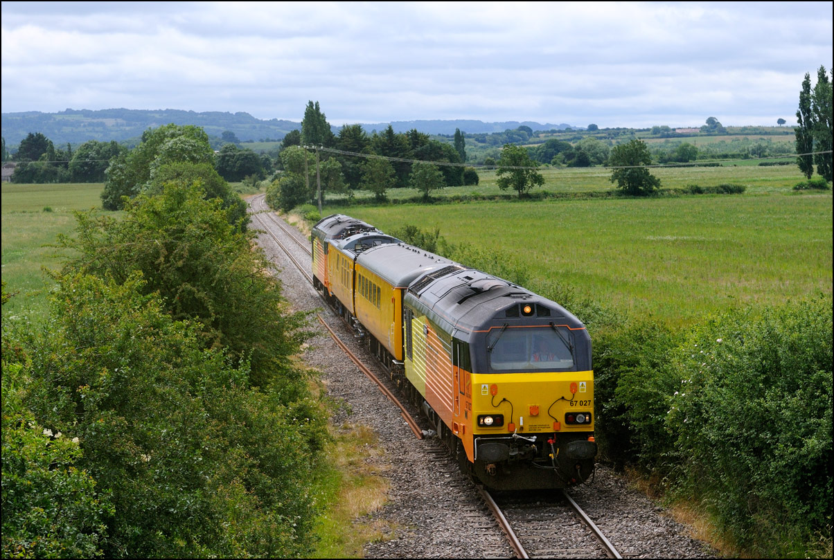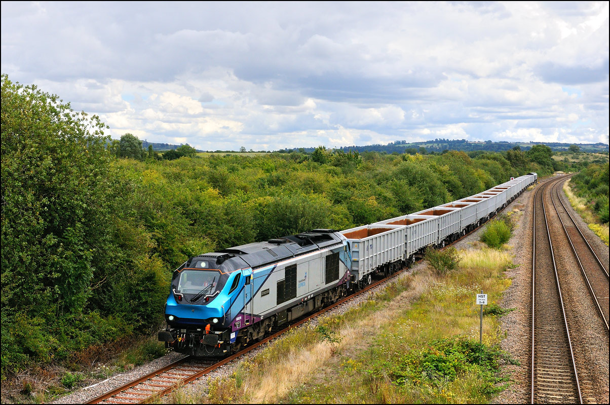 Another Trans-Pennine coaching set was due to be taken from Longsight to Long Marston on 27 August 2024. Unusually, it wasn't cancelled and the unbranded set left Manchester a few minutes late with 68029, also now without the attractive TP colour scheme. The sun was out at home and the sky in the Evesham direction looked to be clearing so I made a late decision to drive over and arrived about 2 minutes before 5Q94 appeared and, and as it turned out, probably about 30 minutes before the sun came out. |