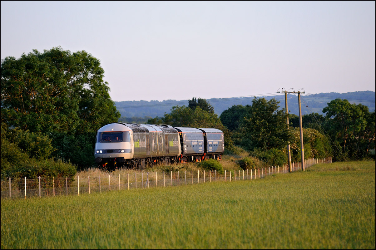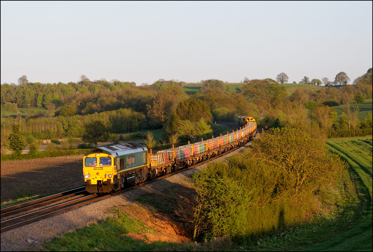 There was another train to Long Marston on 15 May 2024 in the form of another class 68 with a redundant TP coaching set but this was stuck in Worcester Yard waiting for the class 777 move to shunt around in Long Marston yard. Two trains scheduled close together there rarely actually happen as planned and as it seemed likely that 5Q77 with the two 777 units ( 777045 + 777043) would use an earlier path which was really for a TP set leaving the site for Longsight I went out again and headed for Lower Moor in the hope that the sun would co-operate. As luck would have it a clear patch of sky came along with a few moments to spare. I imagine that Rail Adventure would prefer this image of power cars 43468 + 43480 to better represent their image taken as the sun began to fade a bit. |