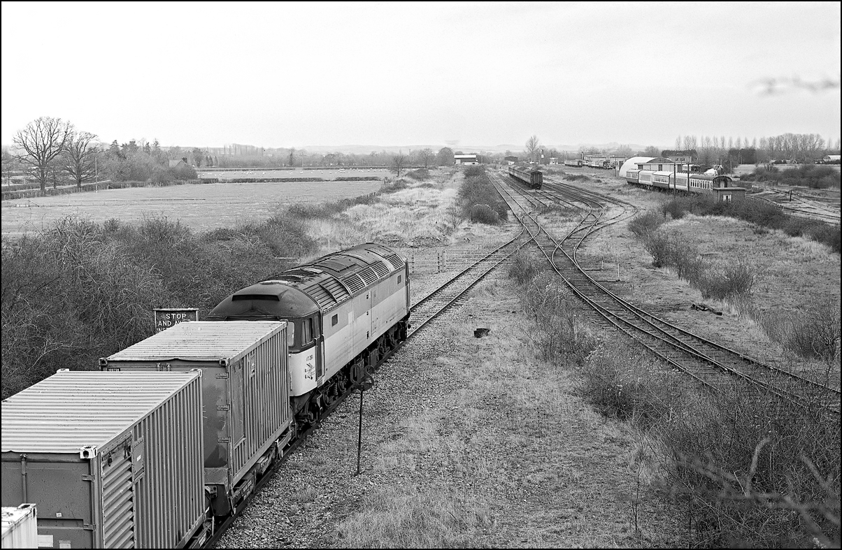 This picture shows 47281 arriving at Long Marston with a MOD train from Didcot on a very wet and dull 11 February 1997. Since the MOD depot closed there has been almost no traffic other than an occasional railtour but this working was to remove some material left on the site. I didn't get to hear about the return; any information was hard to come upon in those day and relied on the right people being told and remembering to pass it on. This was the view looking towards the exchange sidings and yard and makes for an an interesting comparison with that from 2025. |