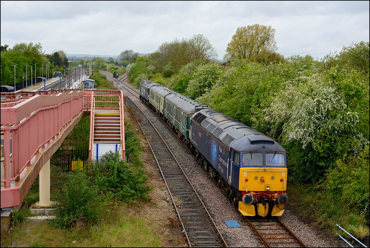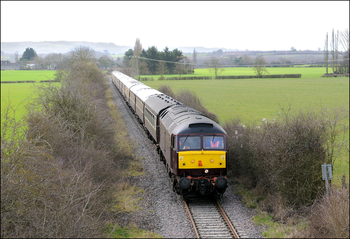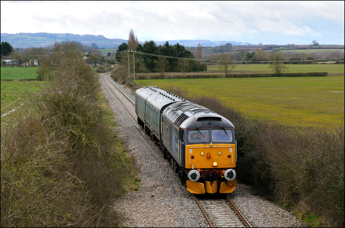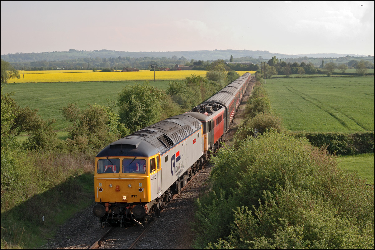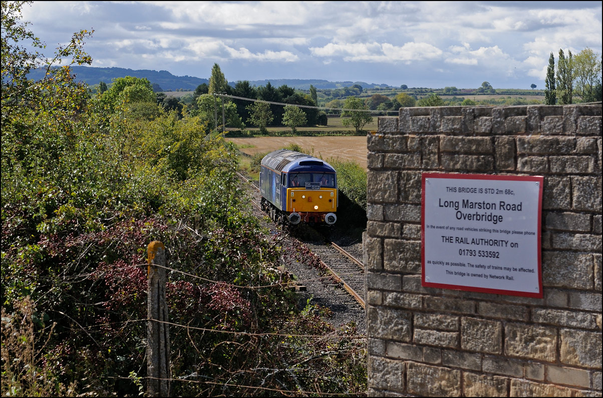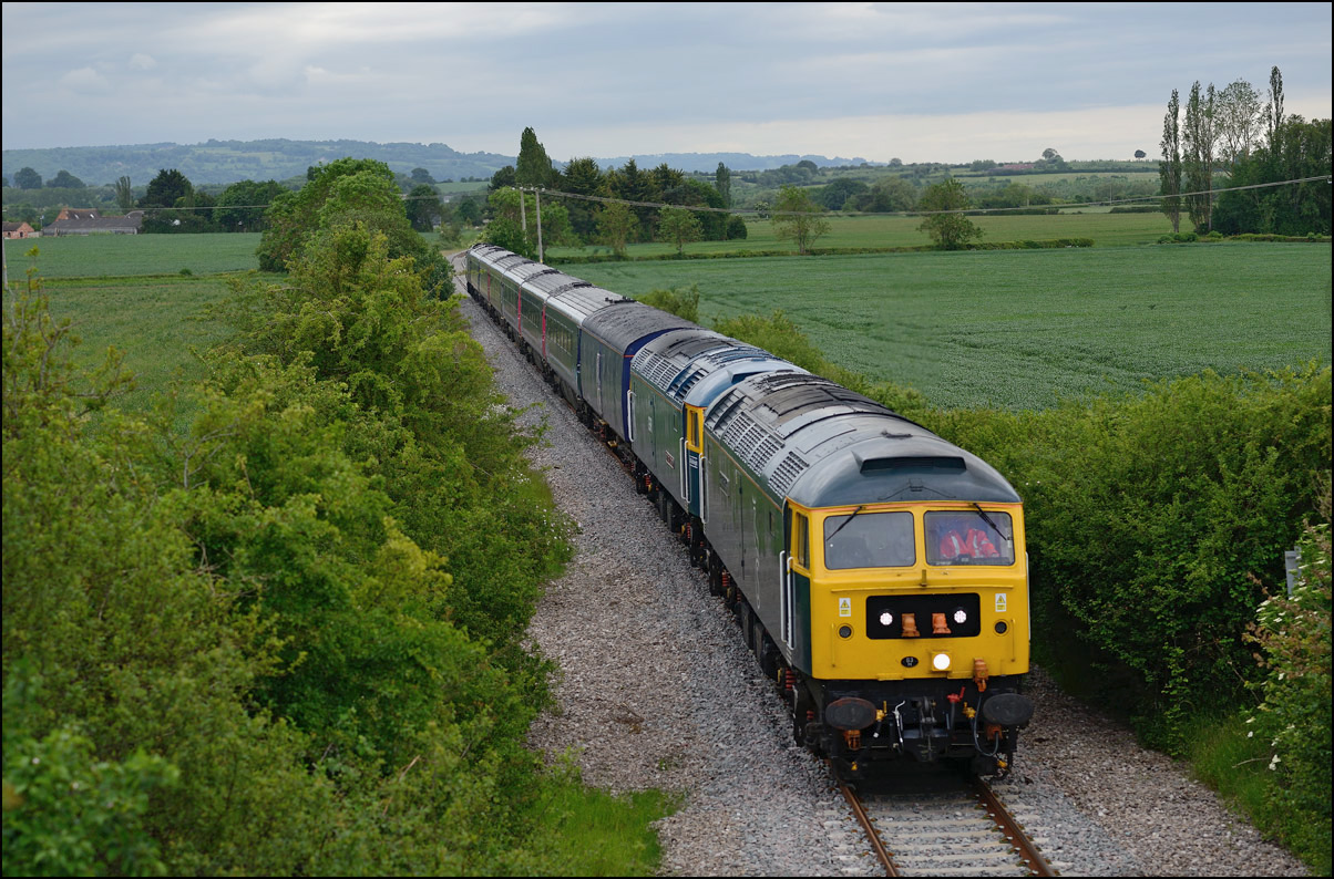 There was plenty of time for the drive to a bridge near Chipping Campden to record the Cromptons leading the train south towards Oxford. This location is just beyond the end of the climb from Honeybourne and the locomotives are putting up a good show of exhaust with the heavy train, still including 47348 on the rear. Typically, after a day of unbroken sun, a large cloud obscured the sun just as the barriers protecting the road at the rear of the train dropped. |