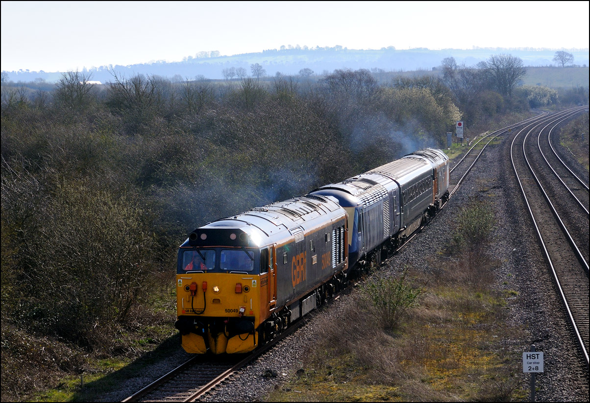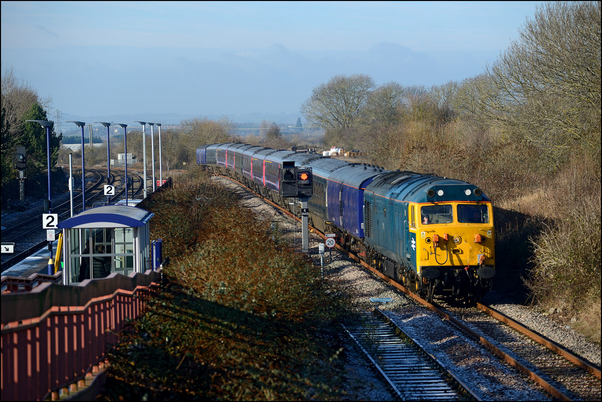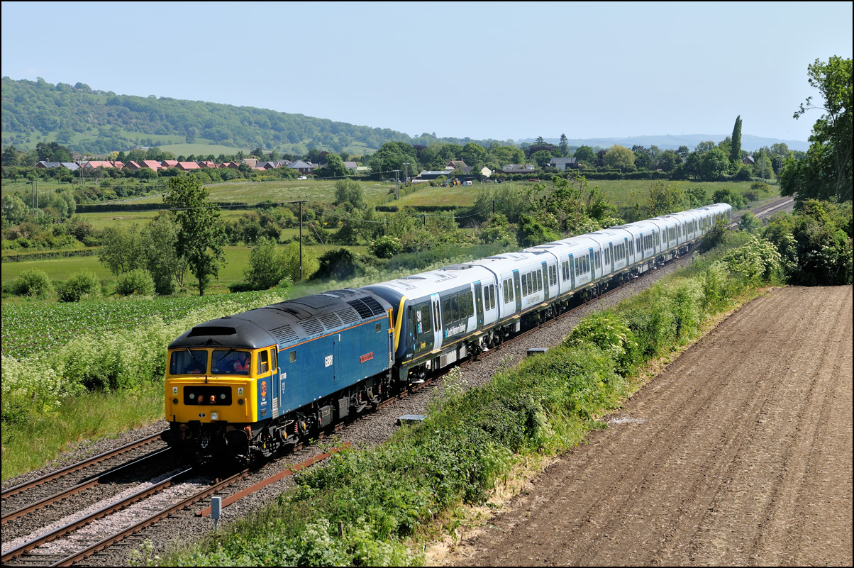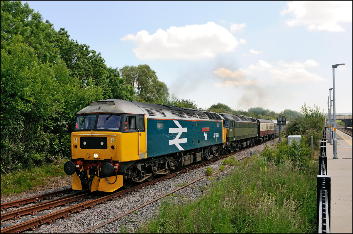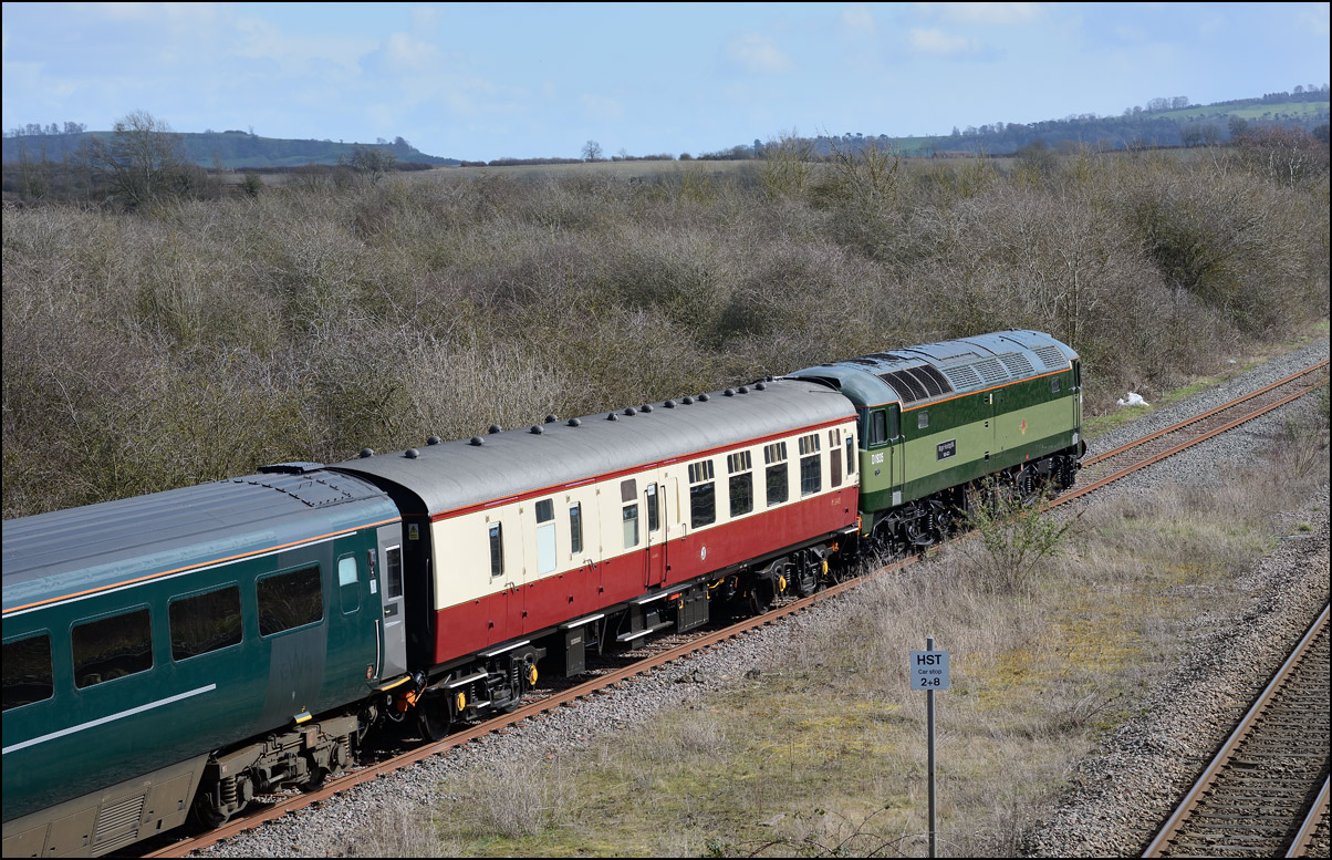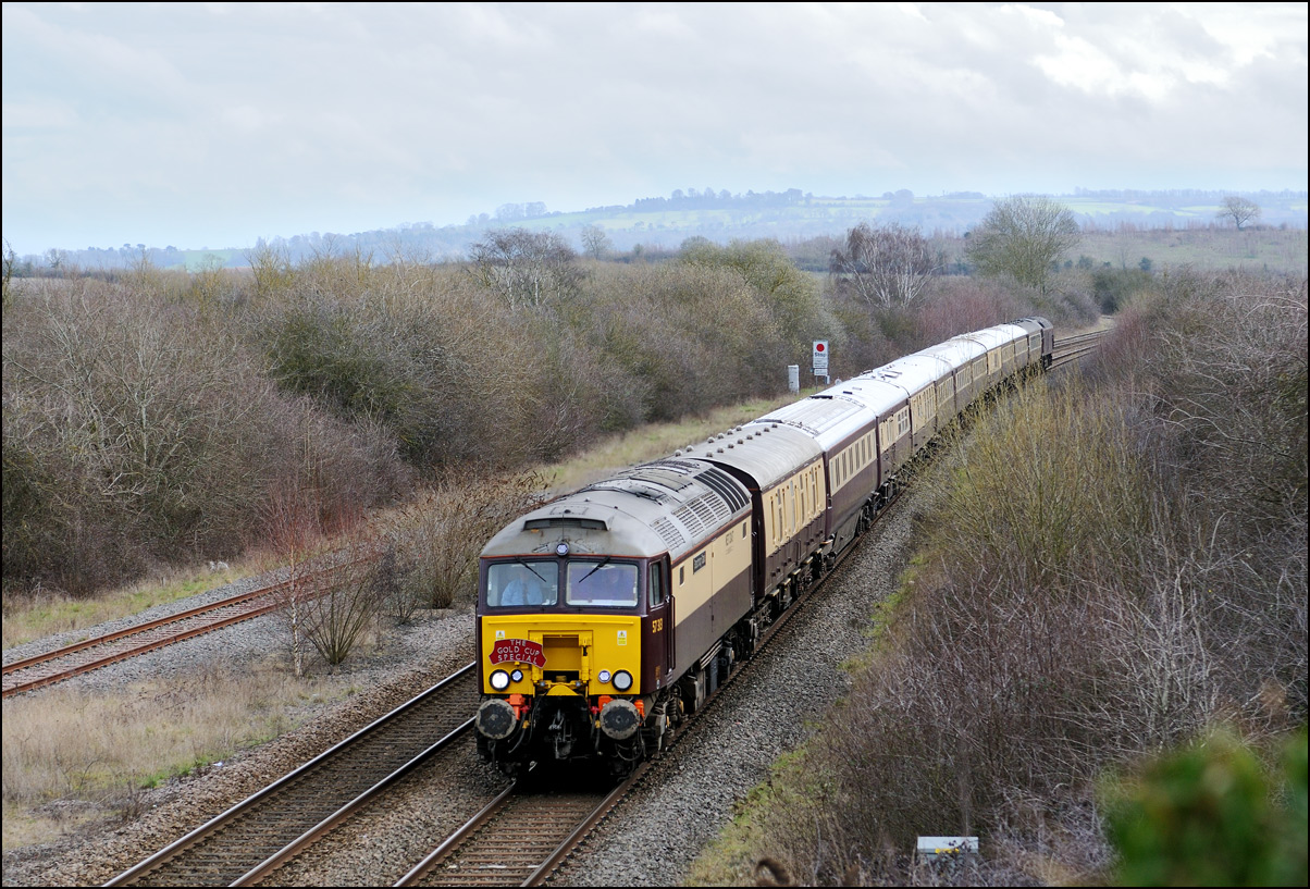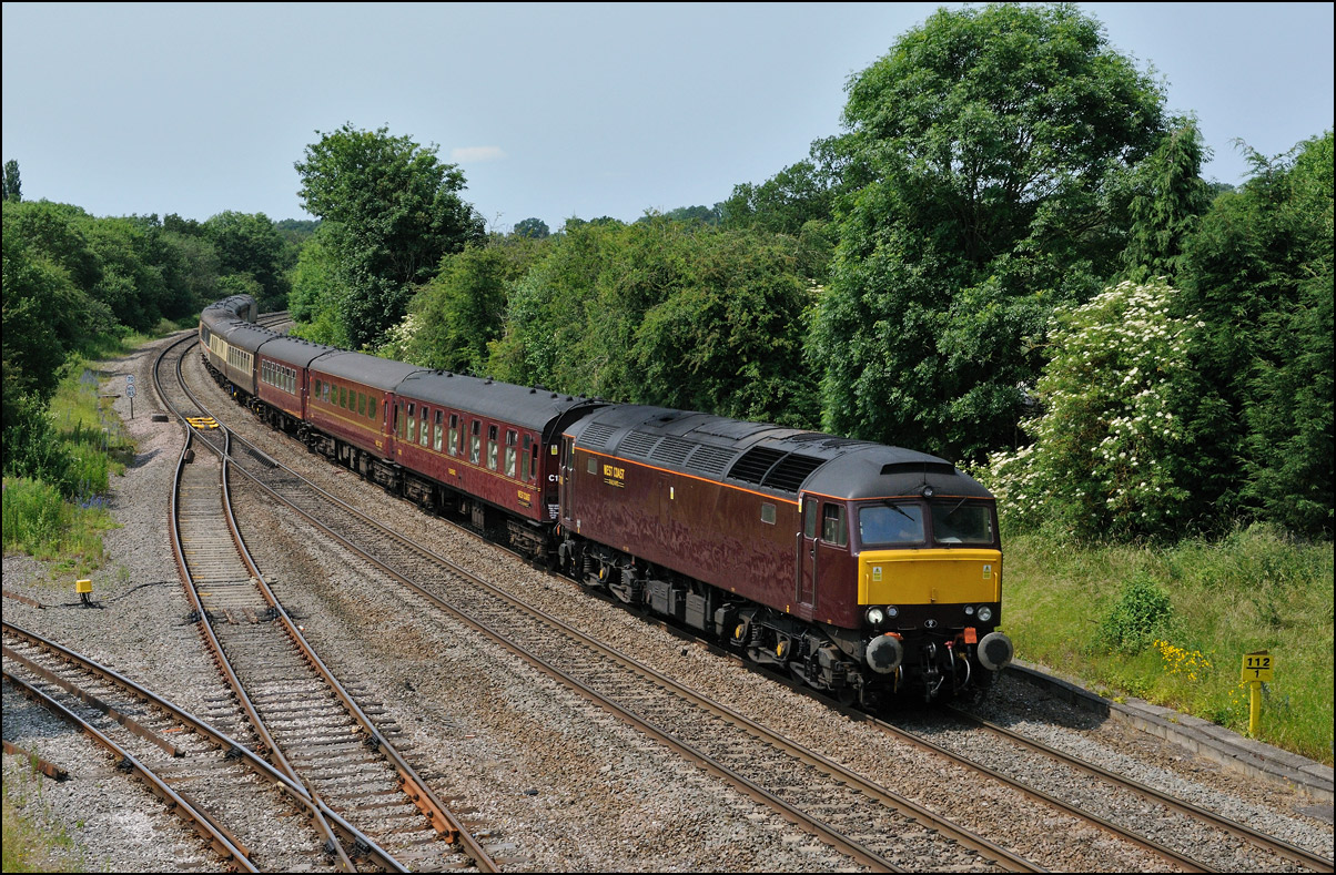 There was plenty of time for the drive to a bridge near Chipping Campden to record the Cromptons leading the train south towards Oxford. This location is just beyond the end of the climb from Honeybourne and the locomotives are putting up a good show of exhaust with the heavy train, still including 47348 on the rear. Typically, after a day of unbroken sun, a large cloud obscured the sun just as the barriers protecting the road at the rear of the train dropped. |