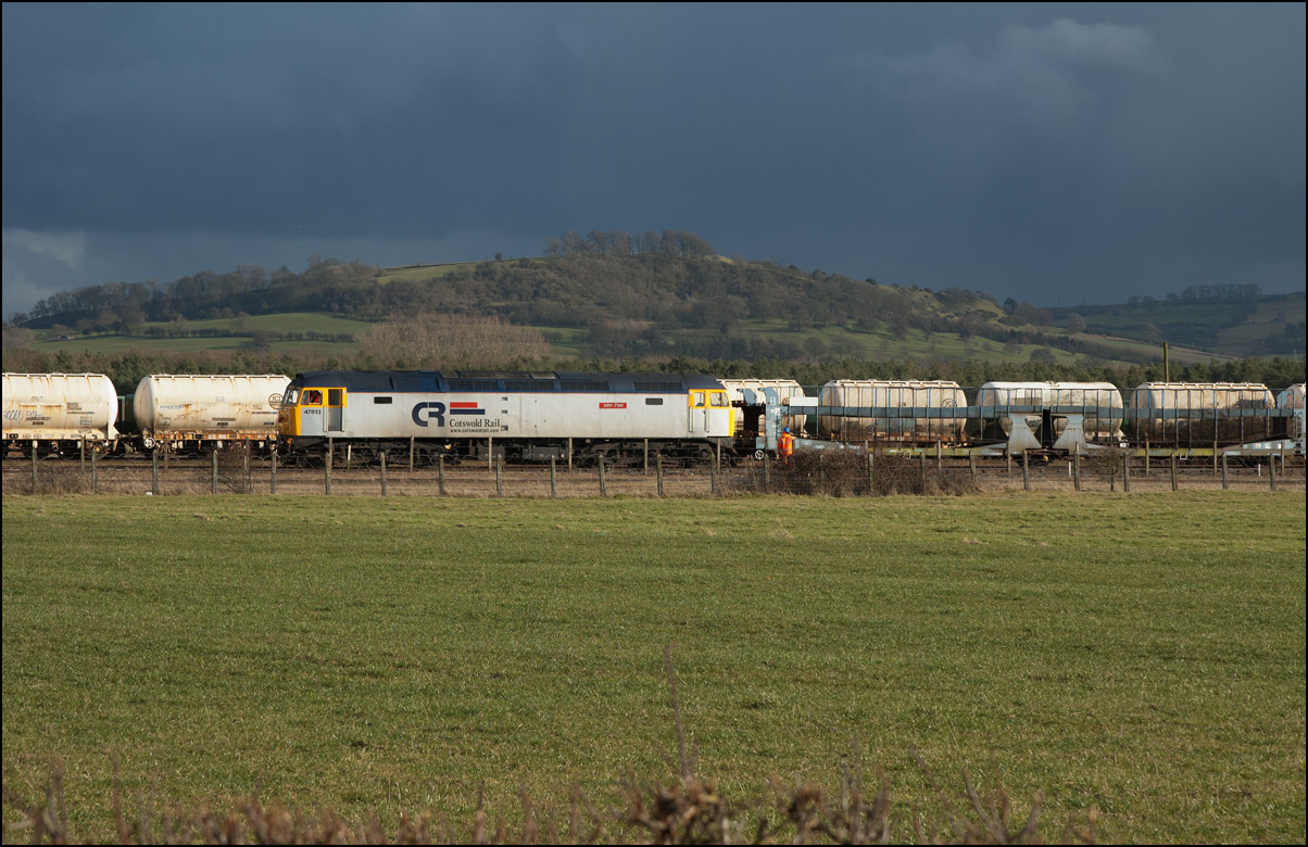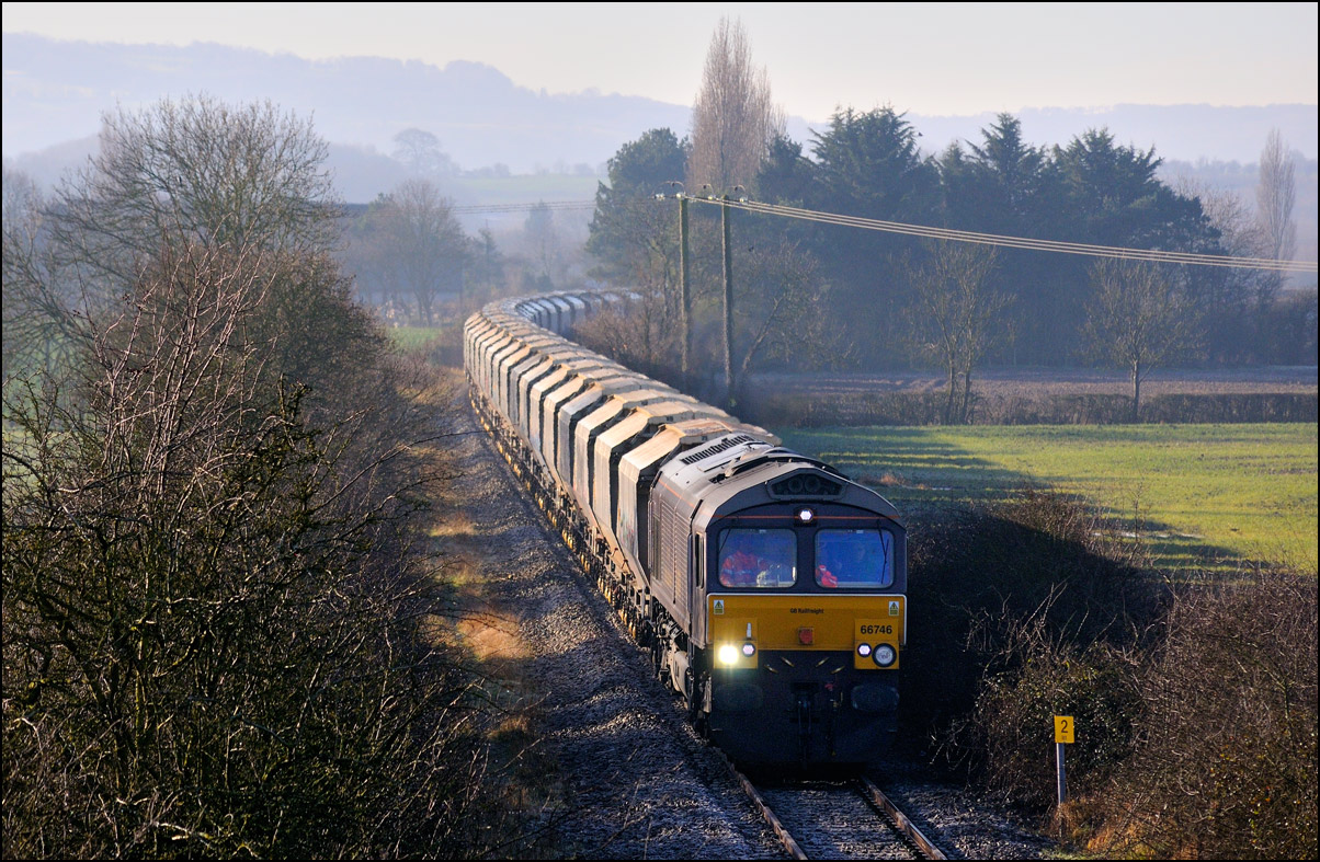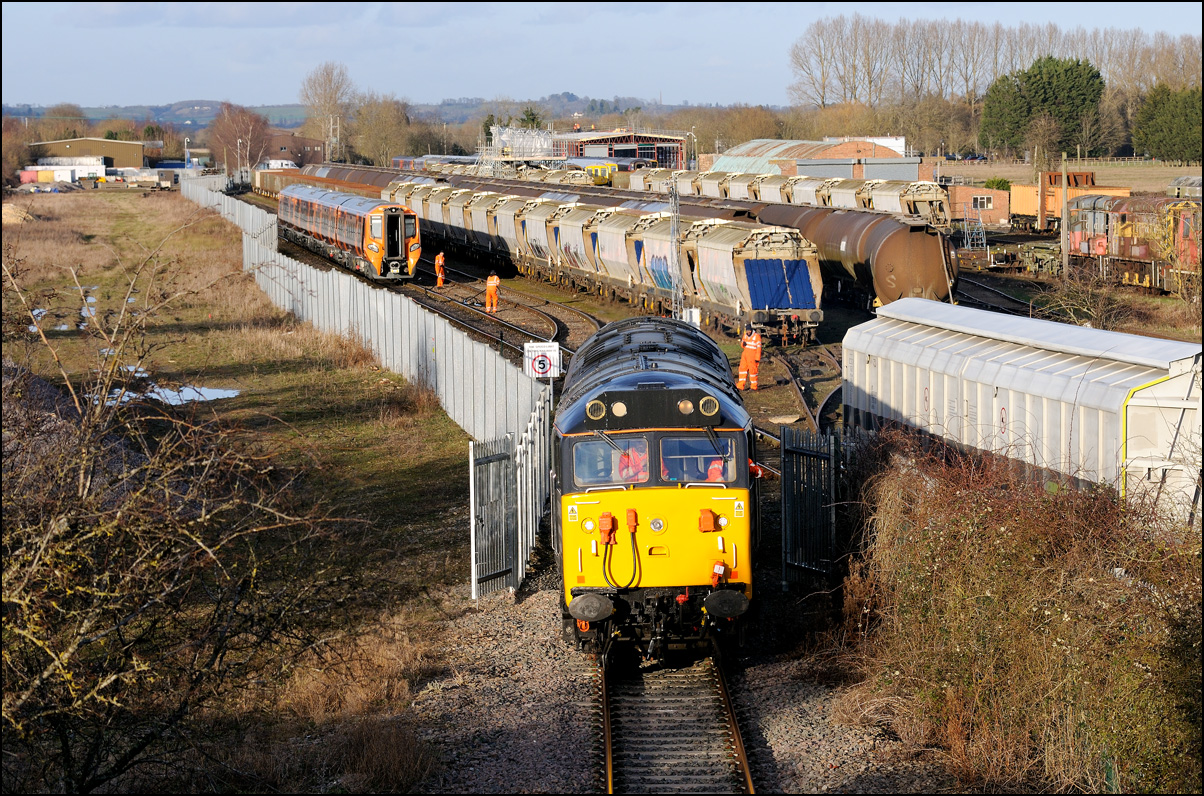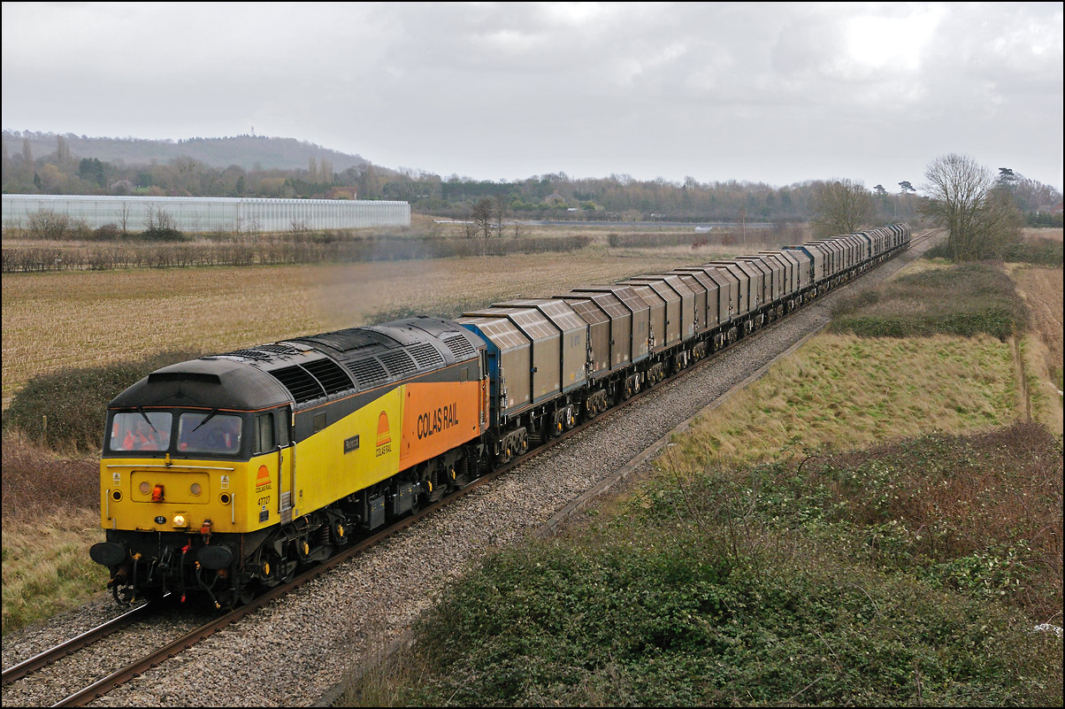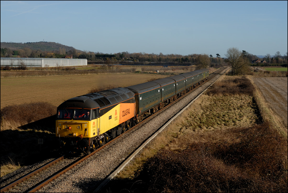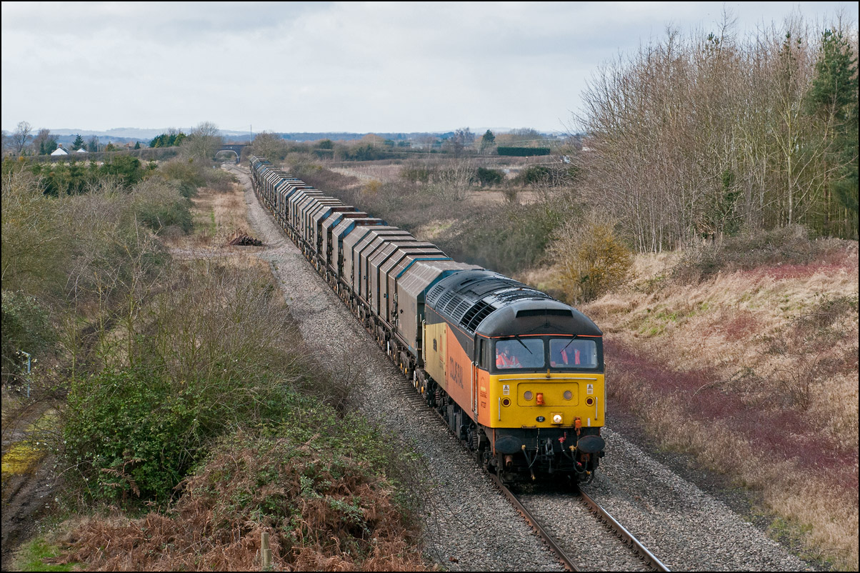 It was perhaps inevitable that one of the 3 trains either going to or from Long Marston on Friday 3 January 2025 wouldn't run on time. The third train, 5Q87 12:34 Long Marston to Reading West Junction (for later transit to Wimbledon), with 701013 being hauled by 47727 left Long Marston about 70 minutes late after some angst for the 3 of us waiting for it near Bretforton about whether it would actually move at all. Shadows were beginning to be a bit of an issue so it was a relief when a yellow end finally appeared in the distance shortly after crossing over from the Long Marston branch. I don't often use a long lens for railway photography but thought that the compressed perspective and out-of-focus foreground would work well, especially as the driver opened up as he approached. |