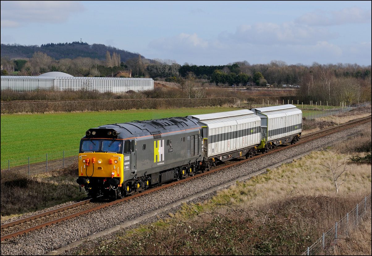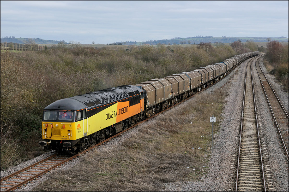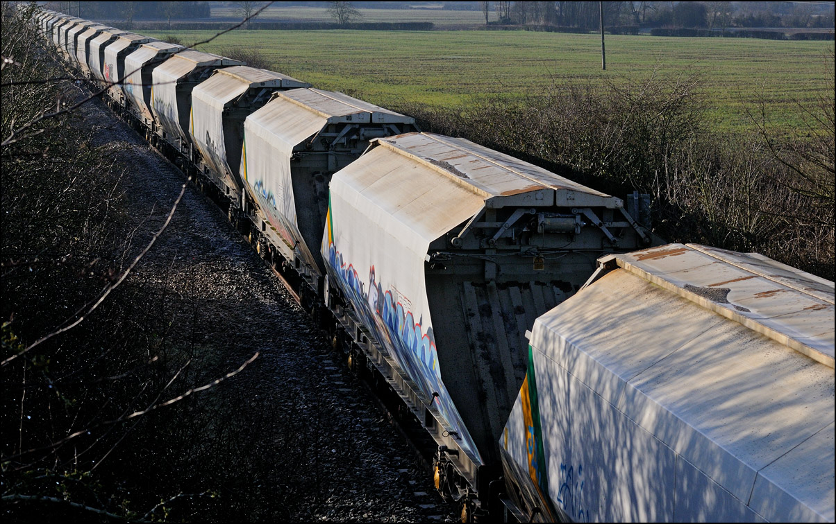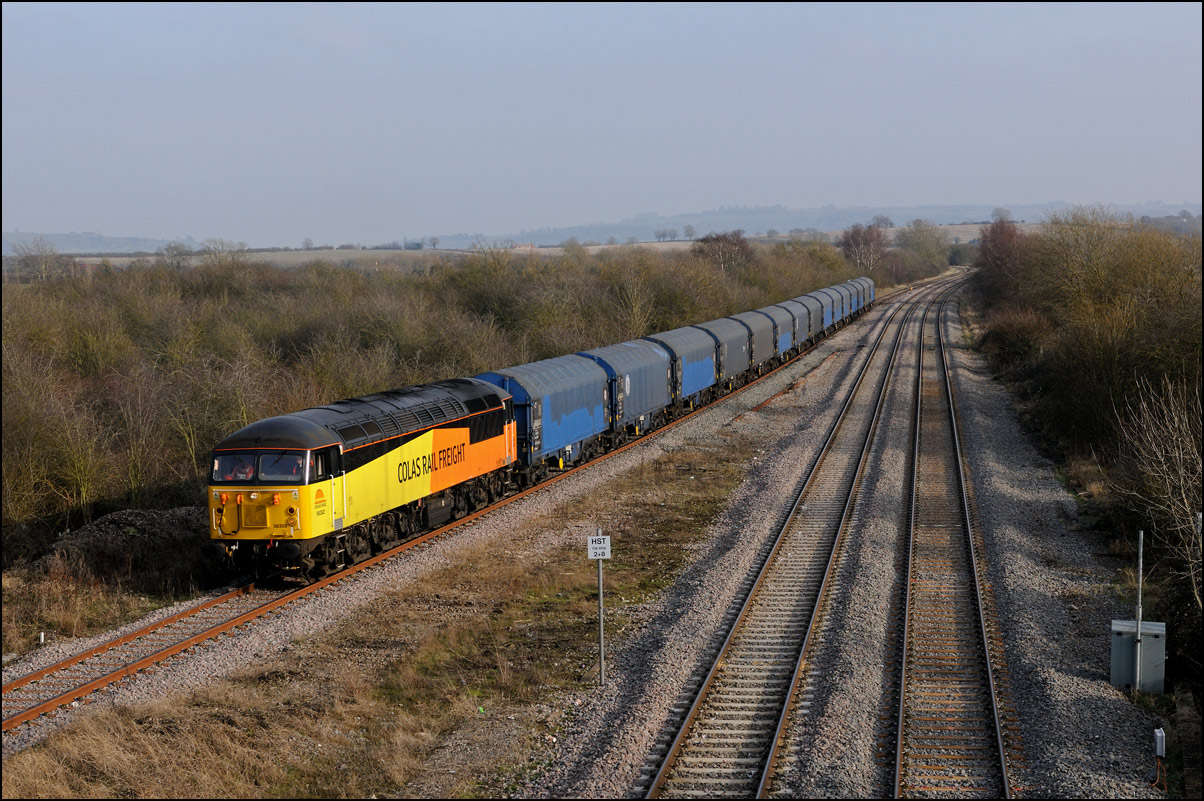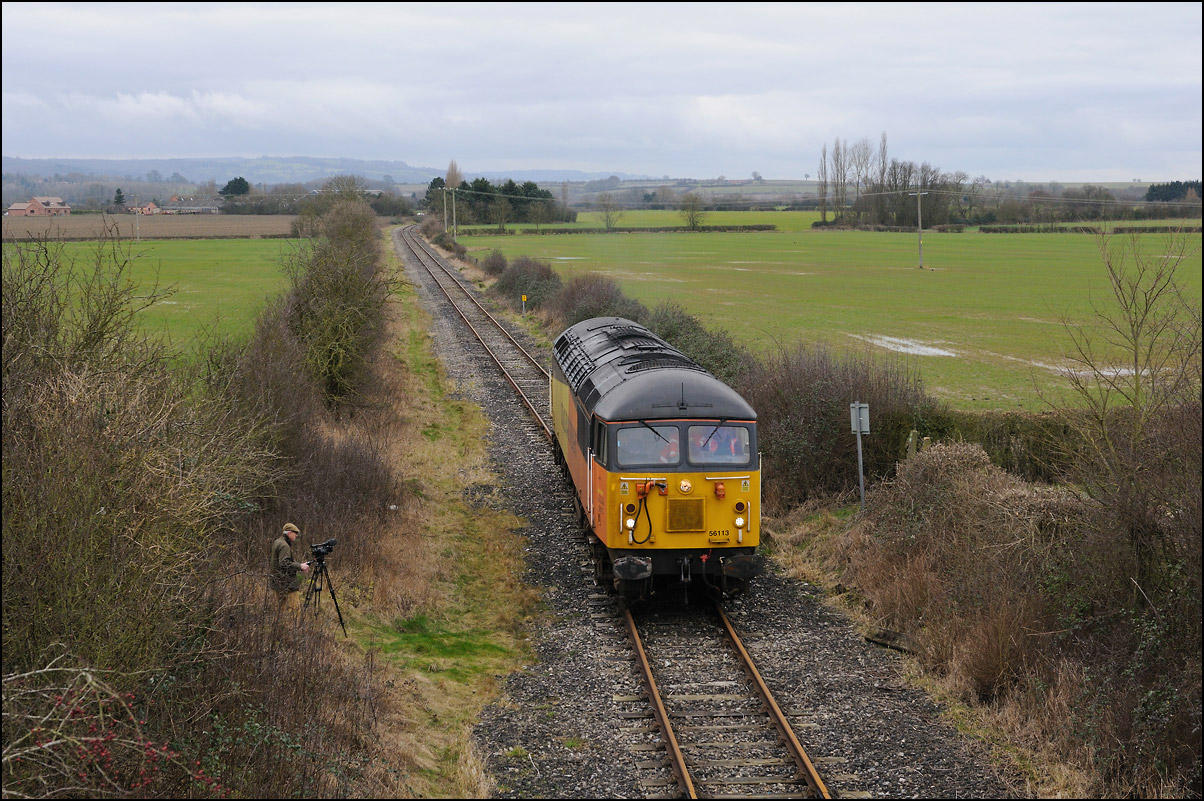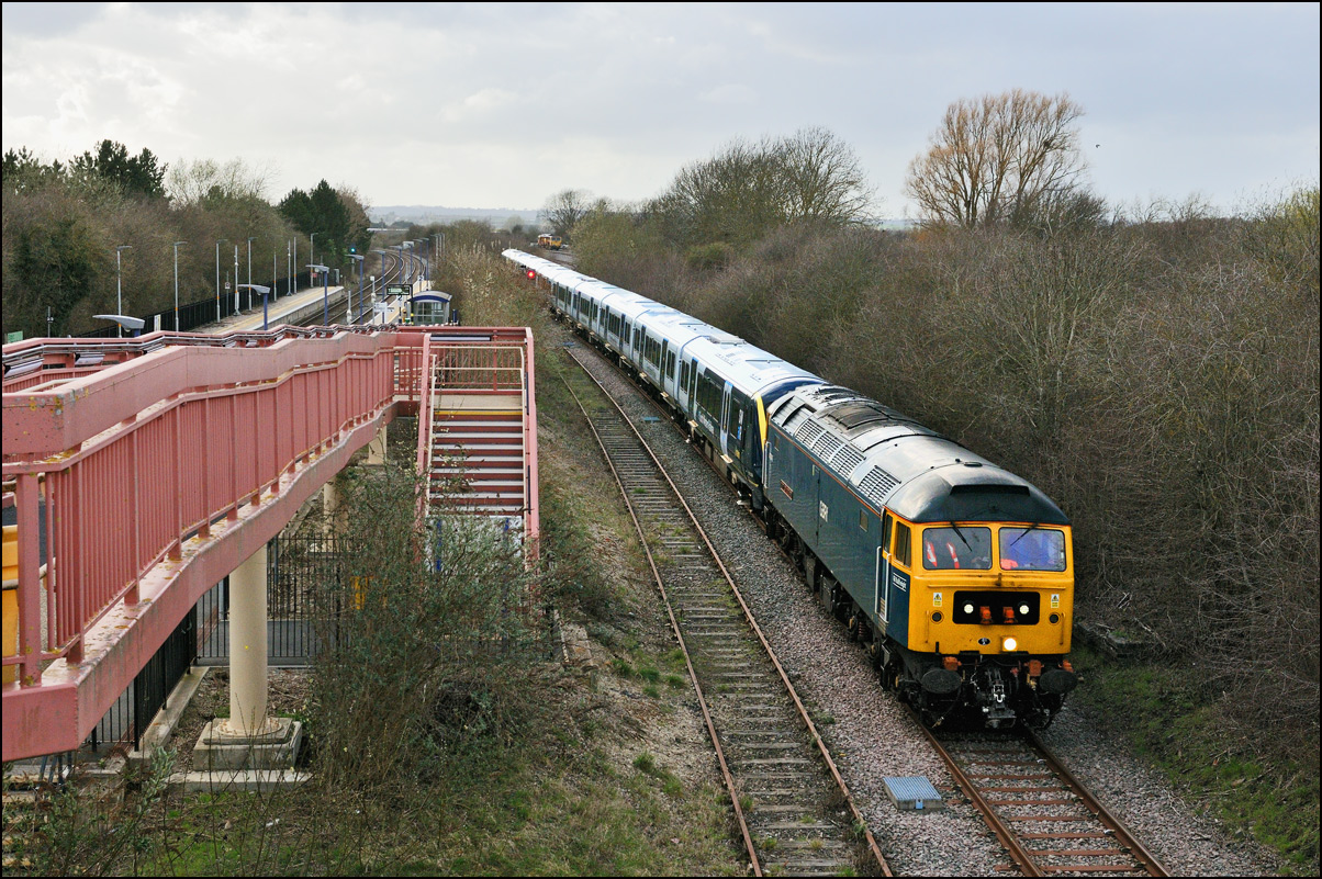 It was perhaps inevitable that one of the 3 trains either going to or from Long Marston on Friday 3 January 2025 wouldn't run on time. The third train, 5Q87 12:34 Long Marston to Reading West Junction (for later transit to Wimbledon), with 701013 being hauled by 47727 left Long Marston about 70 minutes late after some angst for the 3 of us waiting for it near Bretforton about whether it would actually move at all. Shadows were beginning to be a bit of an issue so it was a relief when a yellow end finally appeared in the distance shortly after crossing over from the Long Marston branch. I don't often use a long lens for railway photography but thought that the compressed perspective and out-of-focus foreground would work well, especially as the driver opened up as he approached. |