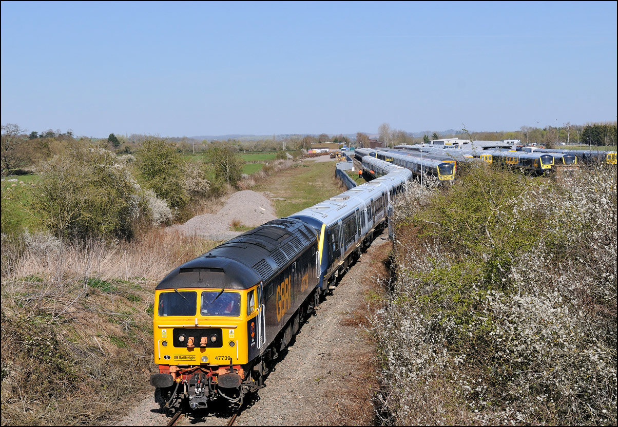There was yet another movement to Long Marston from Eastleigh involving a class SWR class 701 on Thursday 13 February 2025. These trains have been unreliable runners in recent weeks so it was far from certain whether or not this one would actually move from Hampshire. As I was yet to take a picture of GBRf 47739 I went to Evesham, the best local spot for a reasonably wide shot, despite the weather being cold and very dull. Running as 5Q75 it ran spot on time from Norton Junction passing here at 14.02. I took a video clip which was much shorter than I intended because I was checking the camera settings for the still shot and missed it rounding the curve in the distance. I much preferred a previous colour scheme on 47739 as seen as it approached Long Marston yard on 8 July 2013. |