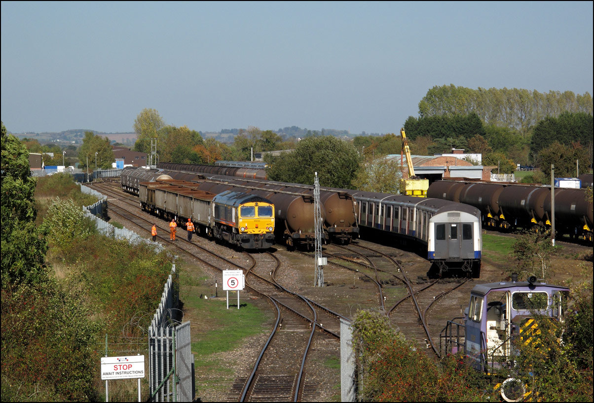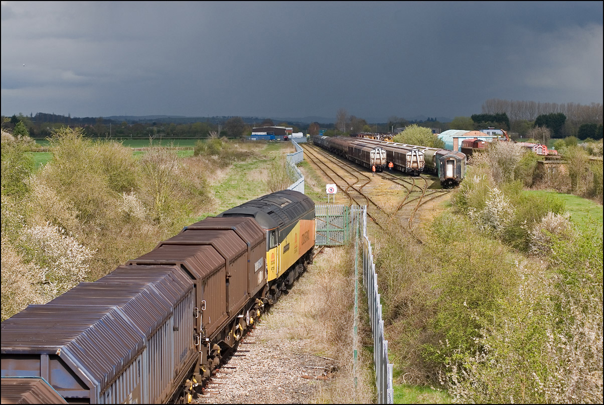 Another train ran Long Marston on 14 October 2005. This time, 47830 brought in a rake of 26 JNA wagons, running as 6Z52, for storage. The train left Crewe over 30 minutes late, apparently after having to wait for a path. This seems strange as one would have thought that the train planners would have put the train into a valid path when setting up the schedule. As a result of this and other factors such as a severe speed restriction on the Sutton Park line and the signallers at Gloucester panel trying to send the train to Gloucester when it arrived at Stoke Works Junction instead of via Droitwich and Worcester, the lateness grew almost exponentially. It finally passed Evesham at 13.15 (booked 10.48) and arrived at its destination at 13.50. The weather? Dreadful. |