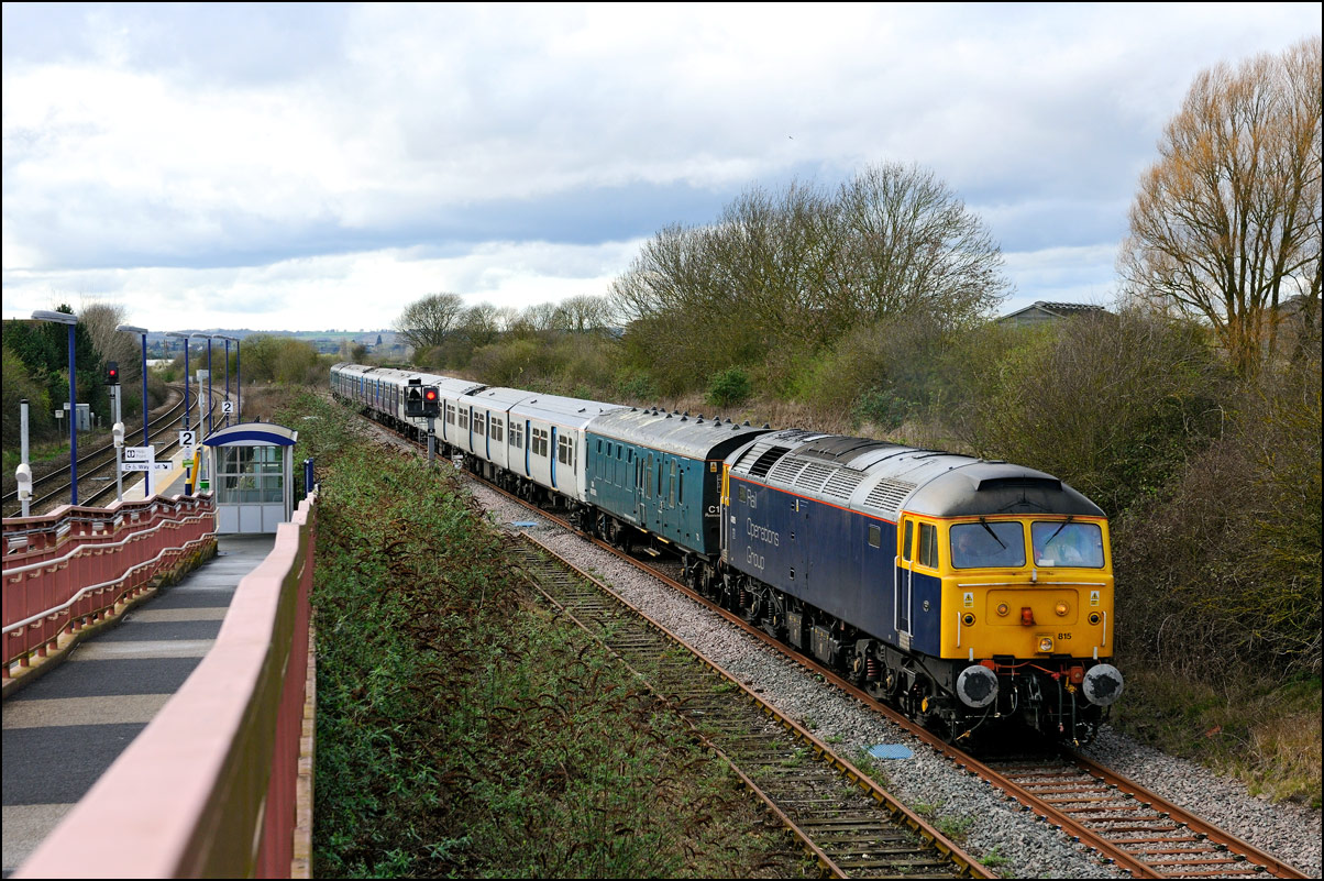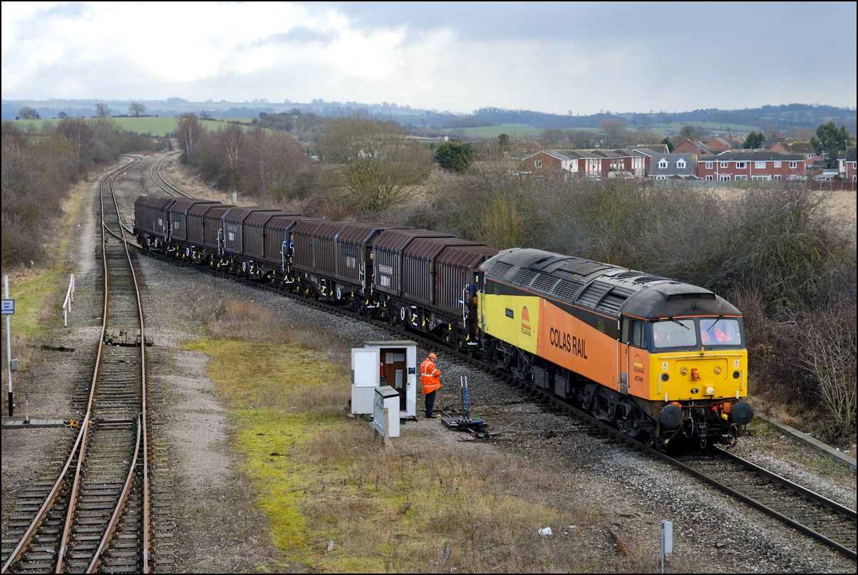 I had hoped that the shot of 47739 with 5Q89 at Long Marston on 1 April 2025 would have been with the sun min the right place for a well-lit conventional shot but the late running meant that a run to Honeybourne was going to be on the cards. A 1969 Morris Minor isn't the ideal vehicle for a quick run around windy country lanes and as I parked by the Co-Op store I could hear the train rolling down the branch. There was just time to put a long lens on my camera as 5Q89 left the Staff Hut where the single line token is kept. |