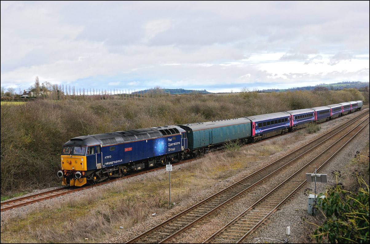 This week's stock move to Long Marston was formed of a rake of cartics moved last year from Bicester to Gloucester, Horton Road. The train ran on 9 March 2006 as 6M55 13.04 from Gloucester and was booked to arrive at its destination at 15.30. My plan was to do at least 4 photographs of the train but the weather at lunchtime was very poor so I decided not to bother. However, at 14.30 the sky looked as if it might clear. When I arrived at Long Marston a huge black cloud was depositing its load of rain on the hill in the background, but as the train hauled by 47813 came into view, right on time, the cloud blew away and the sun appeared. |
