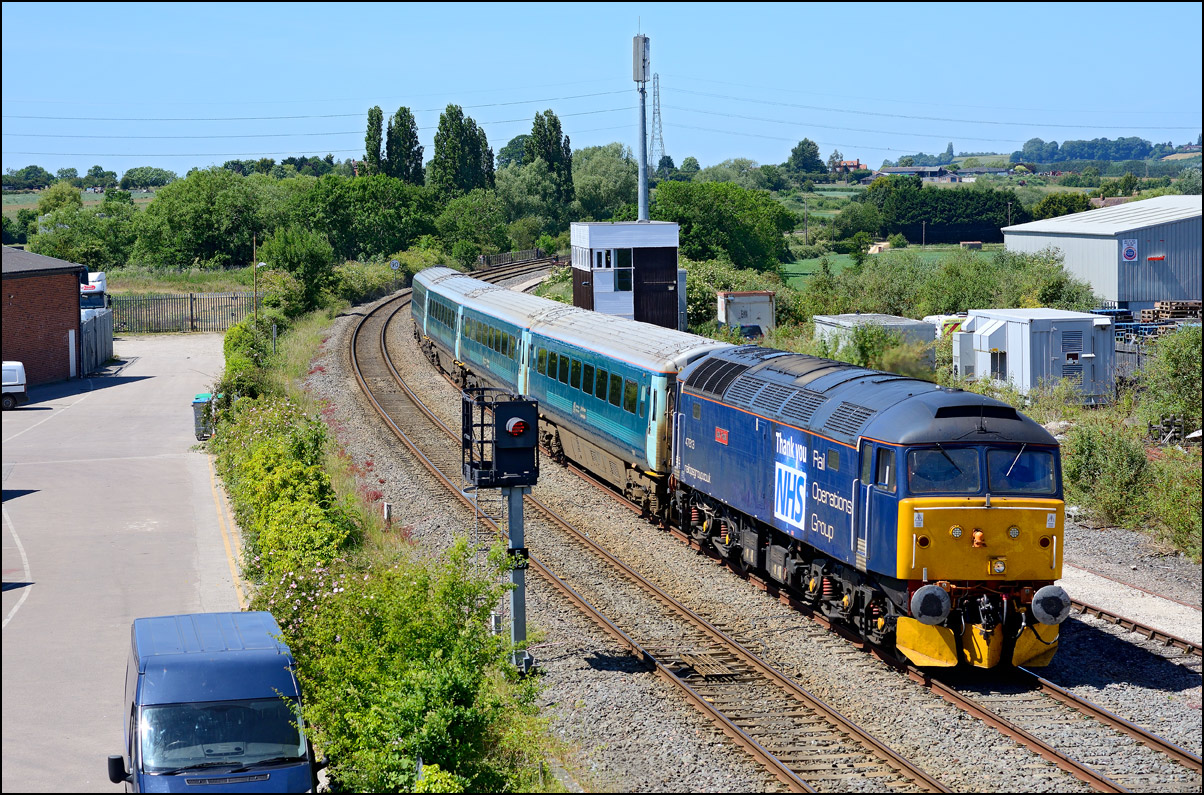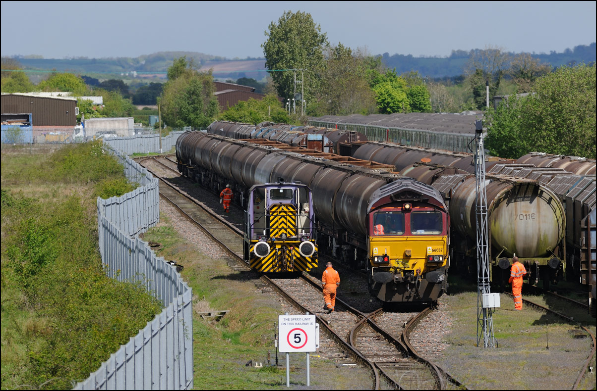 By the time I had driven from Long Marston to Honeybourne, parked in the only space left in the station car park and walked to the roadbridge on 21 June 2024 37601 + 93001 were already at the Staff Hut where the single line token is kept. My longest lens coupled with a bit of post-processing cropping produced this image with the crew having a few minutes in the sun before moving to the signal protecting Honeybourne North Junction. |