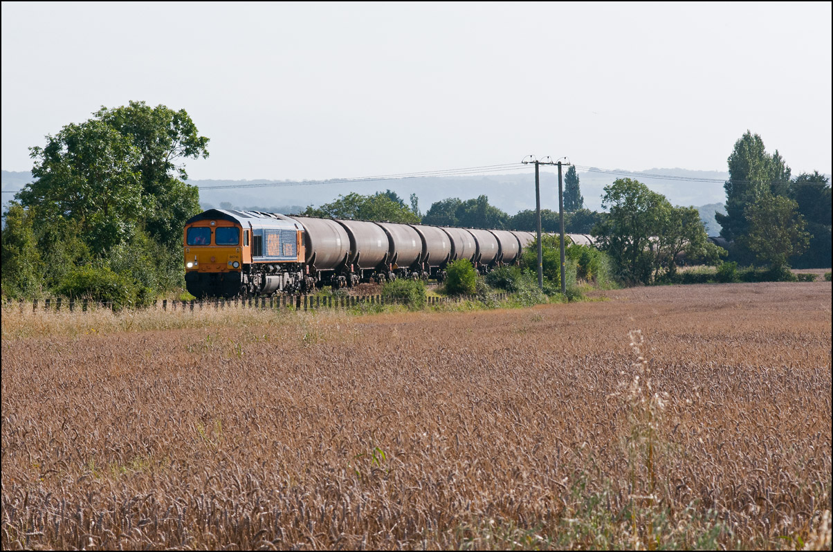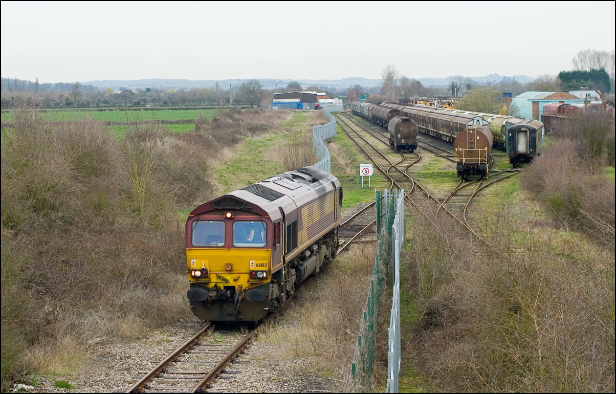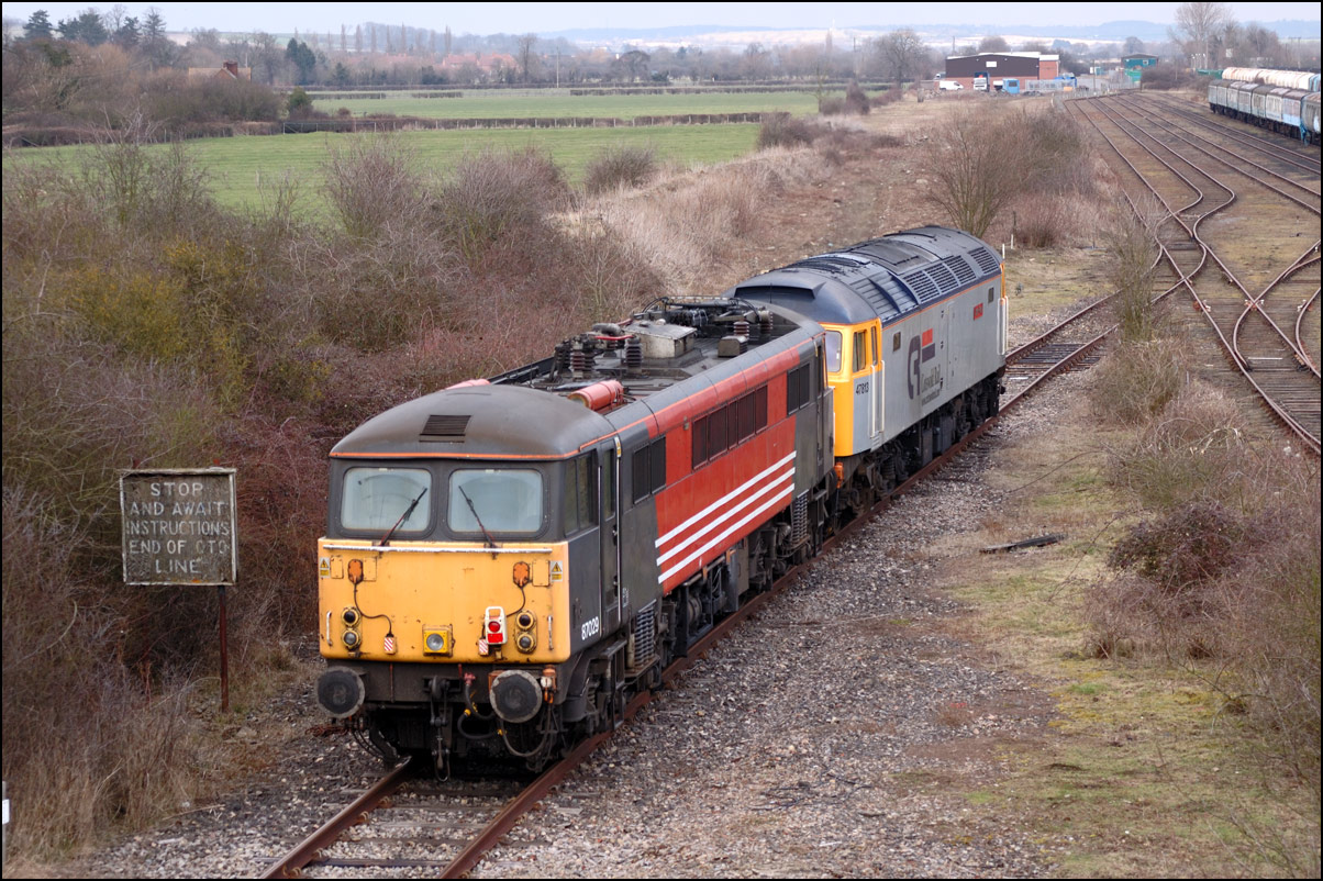 This photograph, taken on 1 May 1992 at Honeybourne Junction, does not have much technical merit, but does show a train on the former east loop. 20901+20904 have just brought the weedkilling train back from Long Marston and, when the main line is clear, will use the crossover in the foreground and then return south to Oxford. At this time the tip, just visible in the background, was still in use and saw trains of spoil from Bescot once or twice each week. The current view is largely unchanged except for the usual unchecked of lineside trees. To be fair, a much more unrestricted vista is available, but a reasonably long lens is needed. Here is a 2008 shot of a class 66 with a 73 standing in approximately the spot. |