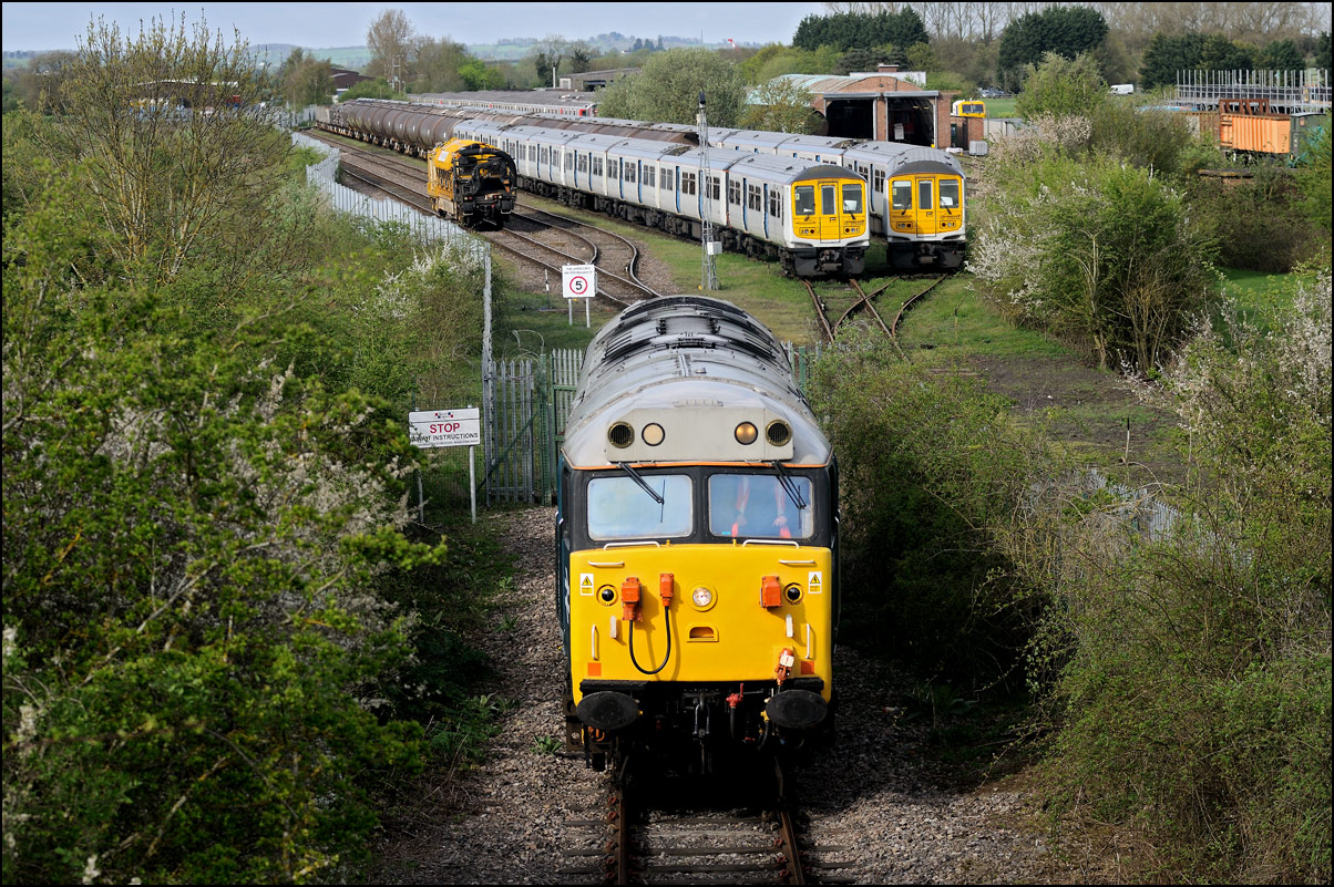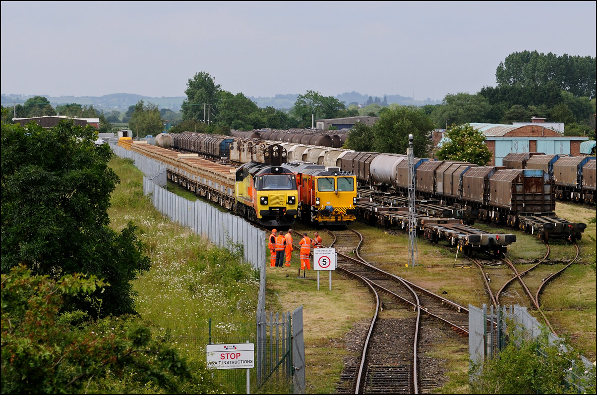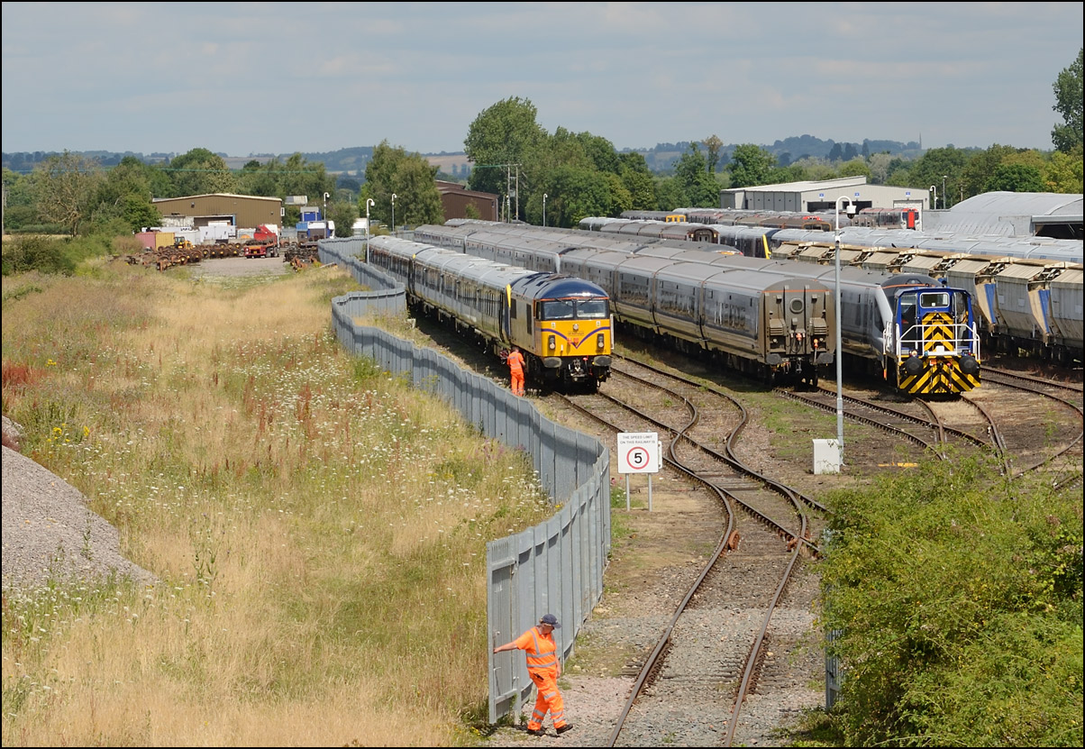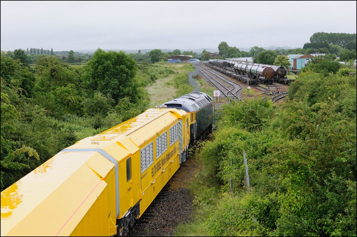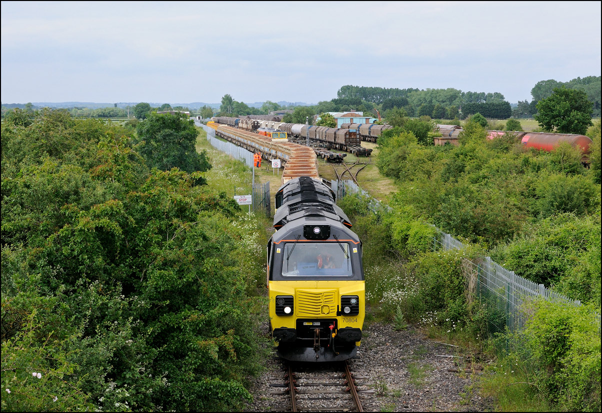 After another struggle with a broken stile at Long Marston on 3 July 2025 it was onto the roadbridge to take a shot as 37407 prepared to propel 350237 to the yard to my right. The ground crew was on its way to switch and clamp the points from the branch to Honeybourne. |