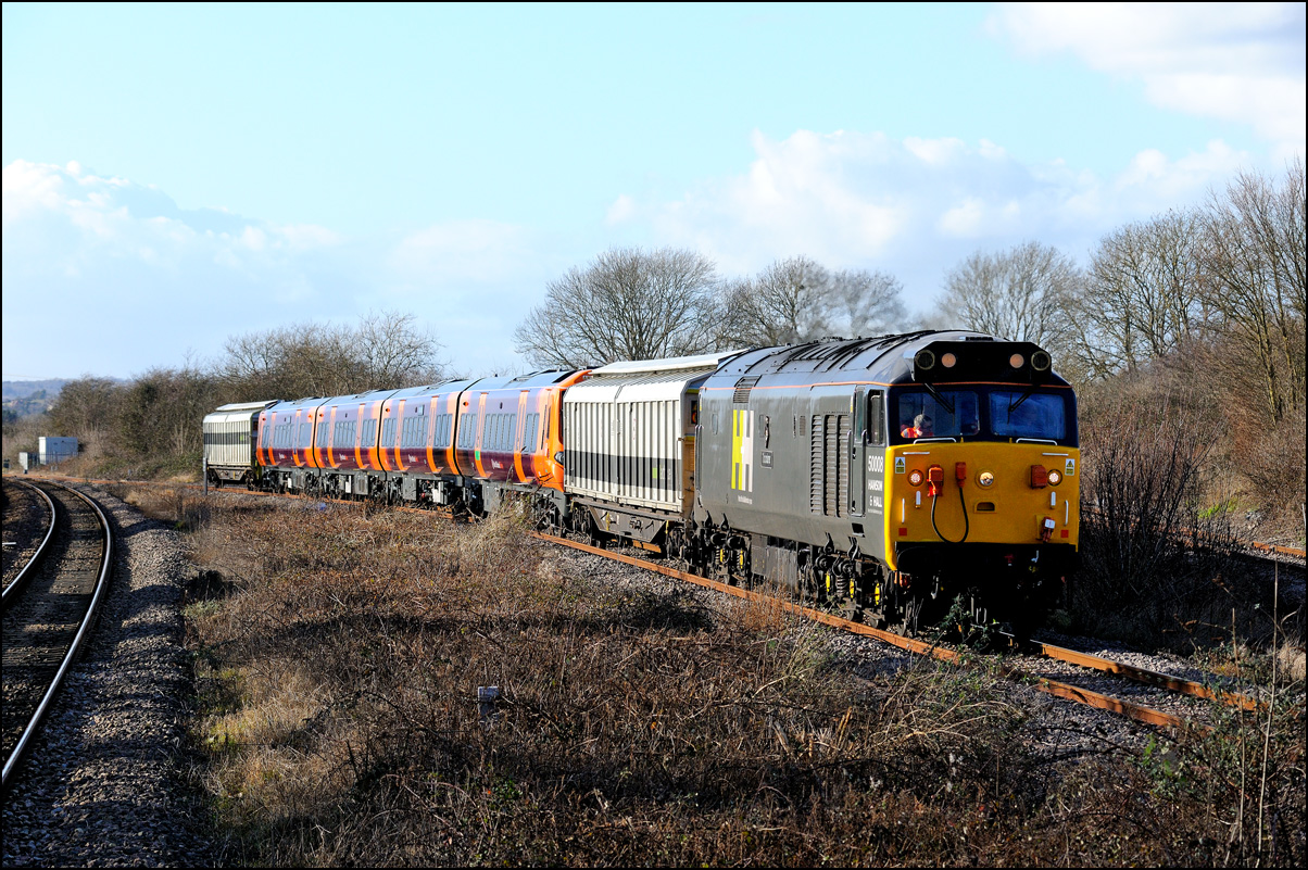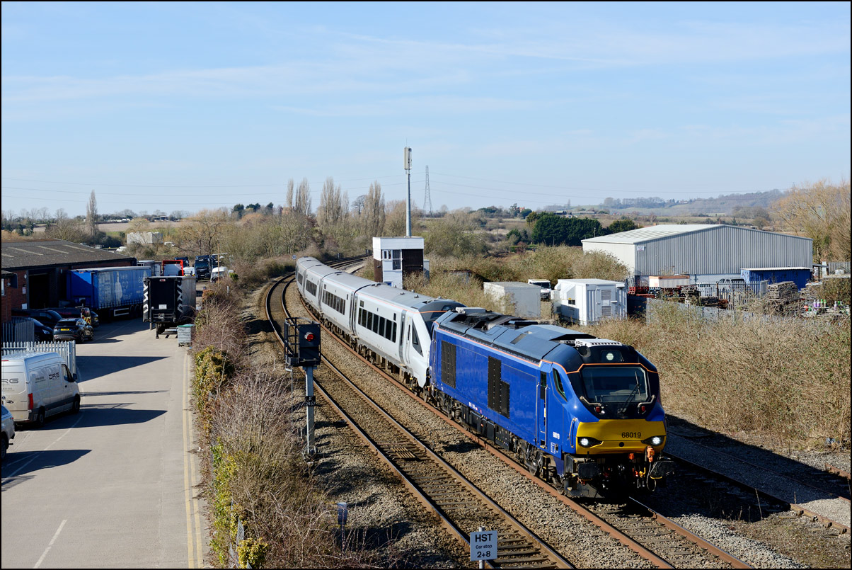 Most weeks see schedules in the system for Longsight to Long Marston trains taking Mk5A stock for storage but in recent times these have rarely run. There was an exception on Wednesday 5 March 2025 when 68019 did work and with a sunny day looming it was worth going for a shot. I hadn't managed a picture of one of these in good light since January 2024 when the class 68 and stock were topped by 37884. Today's 5Q94 was hauled by debranded and very clean 68019 which was a bonus in the lovely light. |