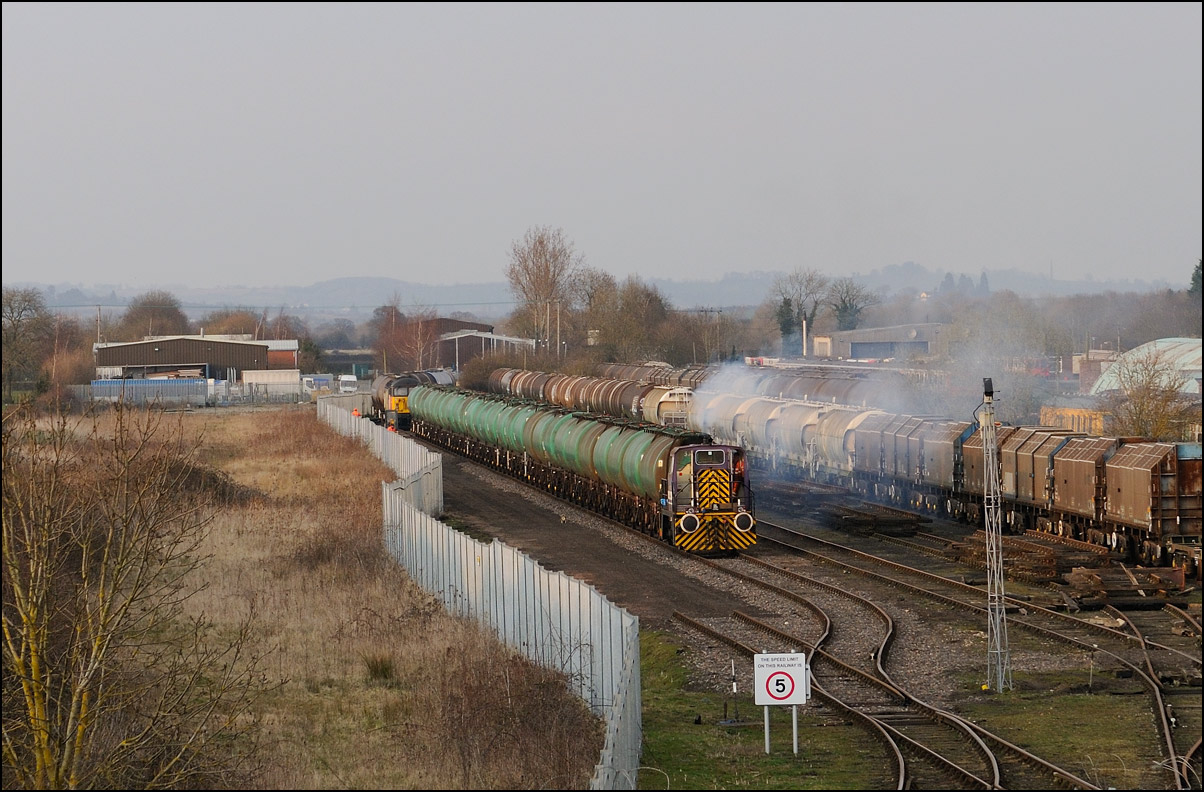Once 47813 had taken the power cars into the exchange sidings, one of the resident shunting locomotives was hooked onto them for the short trip to their final destination. The ensemble is seen here from the roadside at around 15.15 in a nice patch of winter sun. The Sentinel started her days at Oxfordshire Ironstone as "Jean" and was the last loco on the system having powered the demolition trains. From there she went to the mining arm of the giant Corby complex but due to her light weight seems to have seen comparatively little use being noted on PW trains as much as anything else. She then found her way back to Thomas Hill for overhaul following the closure of Sentinel, and then to the nearby Yorkshire Tar Distillers, before ending up here. |