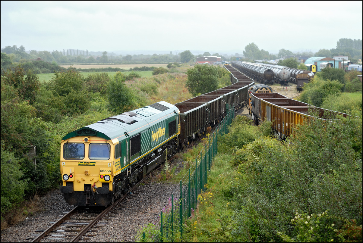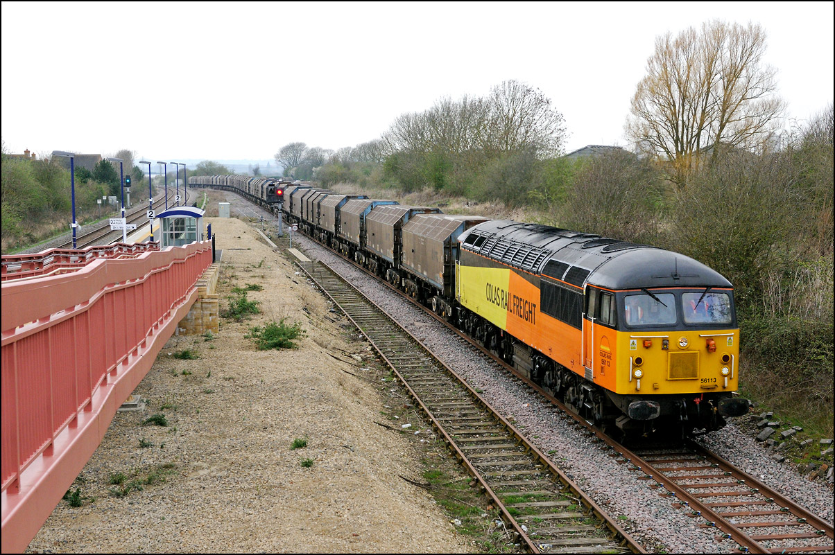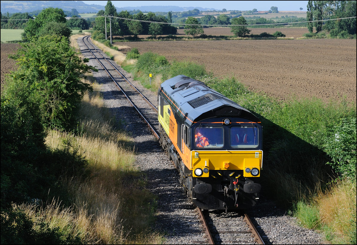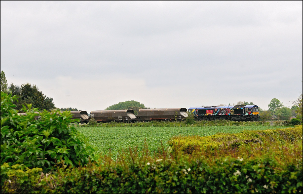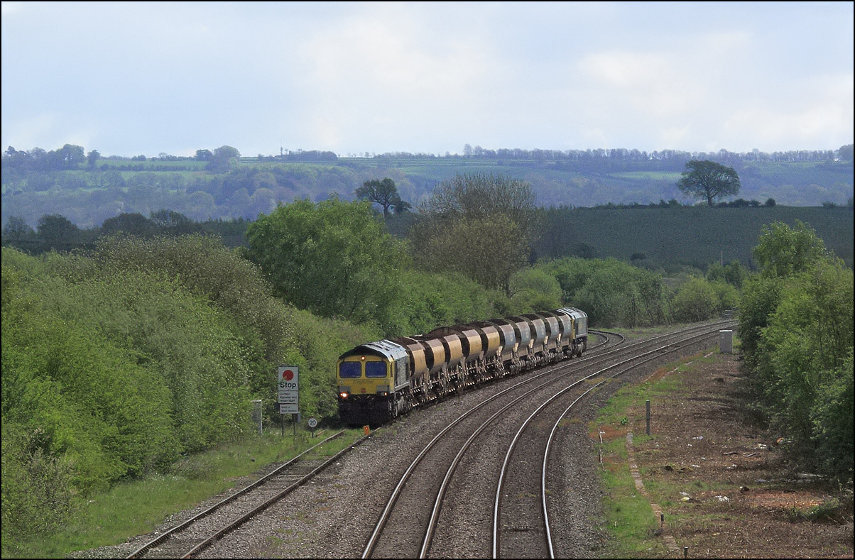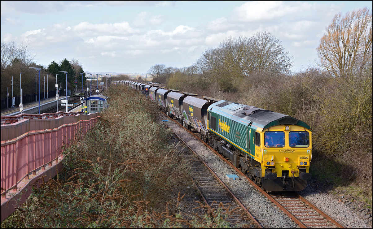 A class 4 train from Crewe Basford Hall to Long Marston came into the schedules for Thursday 29 August 2024. It was obviously a Freightliner job and turned out to be 66511 with 7 branded coal hoppers. This was a very welcome change from endless coaching stock movements but where to take a shot around 15.00 on a sunny day left few options other than around Evesham where the line drops down to the south-west. I chose the footbridge at Evesham station where the sun dipped a few minutes before 4Z66 appeared. On 8 March 2012 the same locomotive with a full set of hoppers working 11.15 Rugeley Power Station to Stoke Gifford through Defford. |