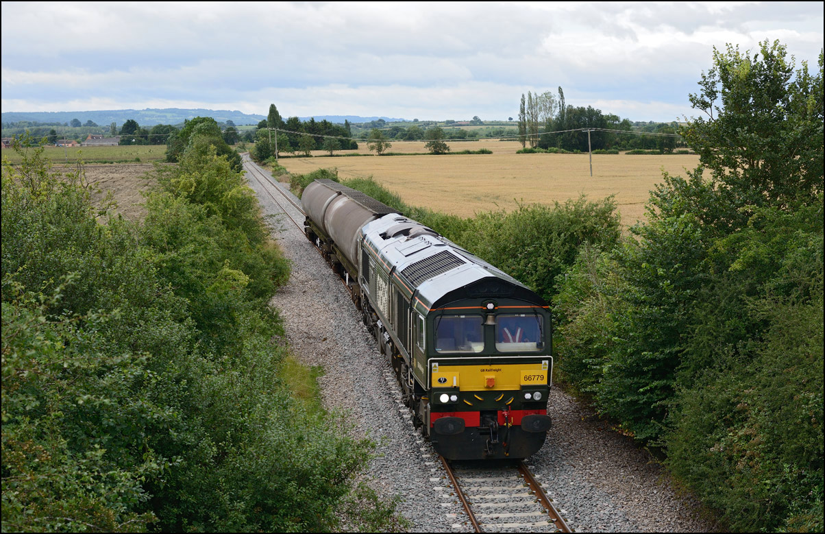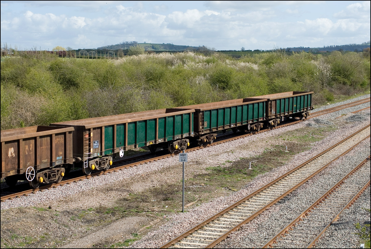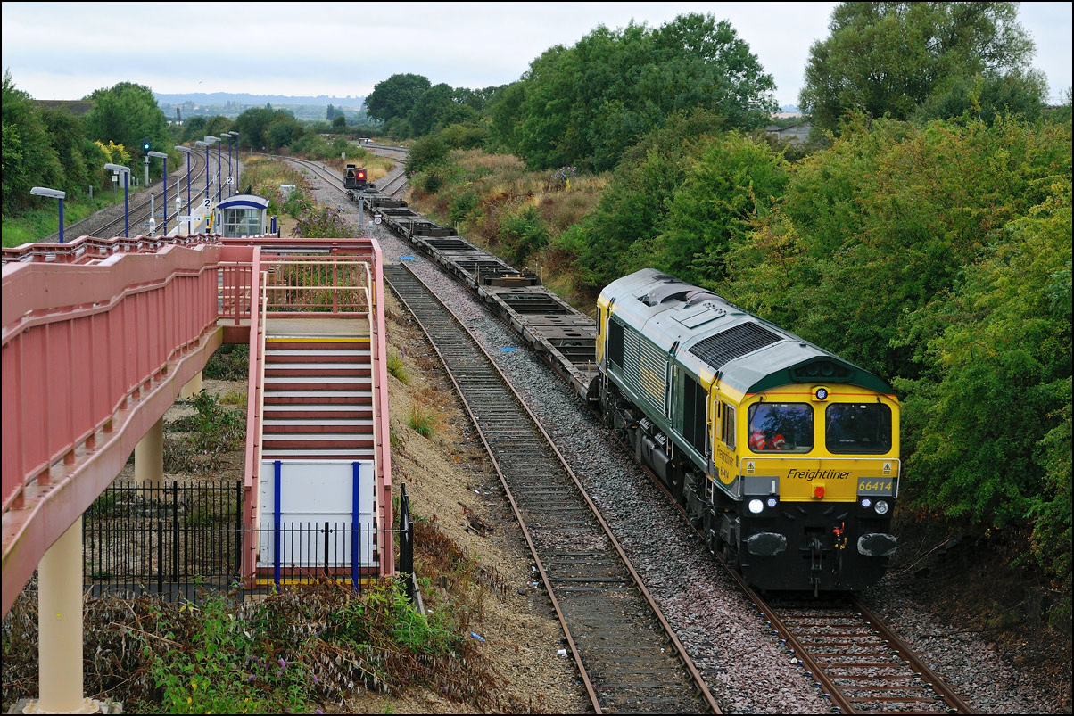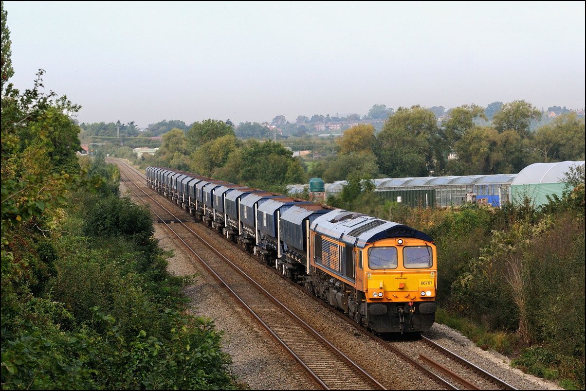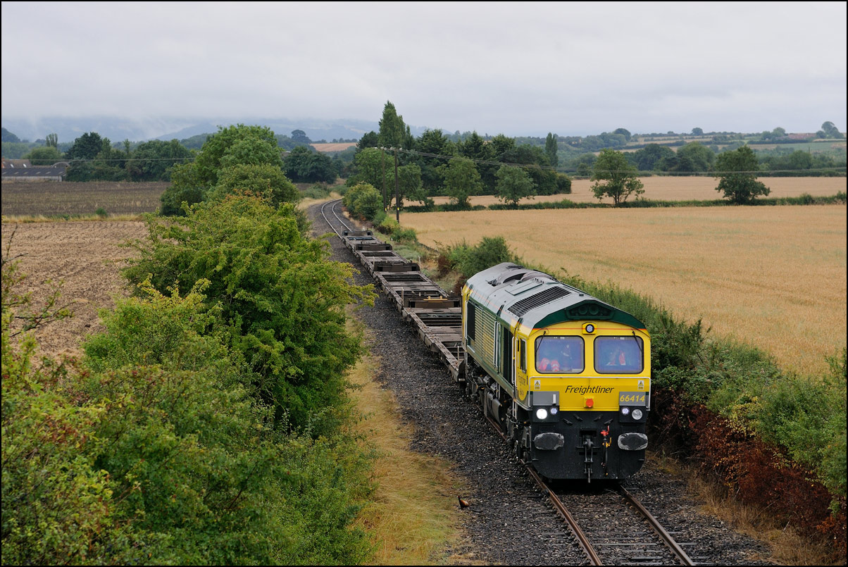 A class 4 train from Crewe Basford Hall to Long Marston came into the schedules for Thursday 29 August 2024. It was obviously a Freightliner job and turned out to be 66511 with 7 branded coal hoppers. This was a very welcome change from endless coaching stock movements but where to take a shot around 15.00 on a sunny day left few options other than around Evesham where the line drops down to the south-west. I chose the footbridge at Evesham station where the sun dipped a few minutes before 4Z66 appeared. On 8 March 2012 the same locomotive with a full set of hoppers working 11.15 Rugeley Power Station to Stoke Gifford through Defford. |