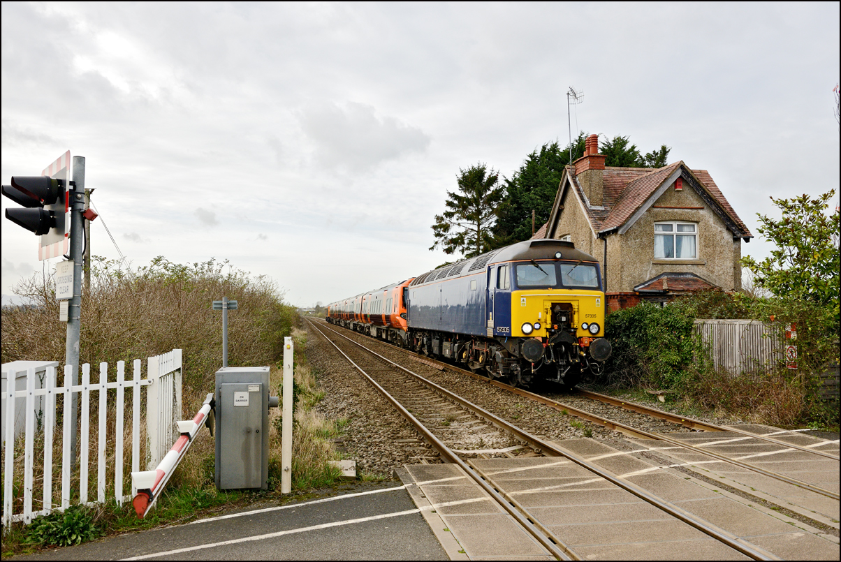 Another class 196 DMU was taken for repair or maintenance from Tyseley to Long Marston on 11 November 2024. This is time it was 4-car 196105 moved by GBRf with 57305 and 57310 topping and tailing the unit rather than ROG's 37s as on a couple of previous occasions. I had hoped that the GBRf liveried 57310 would be leading but it was 57305 in plain blue that turned up on the front of 7Q57. This locomotive previously carried a smart brown and cream Pullman-style colour scheme as seen with some barrier coaches at Hatton in 2019. I shot some video as 7Q57 approached and passed the crossing keeper's house but was disappointed that the klaxons sounded continuously: they used to stop once the barriers had dropped for the benefit of the residents in the house. |