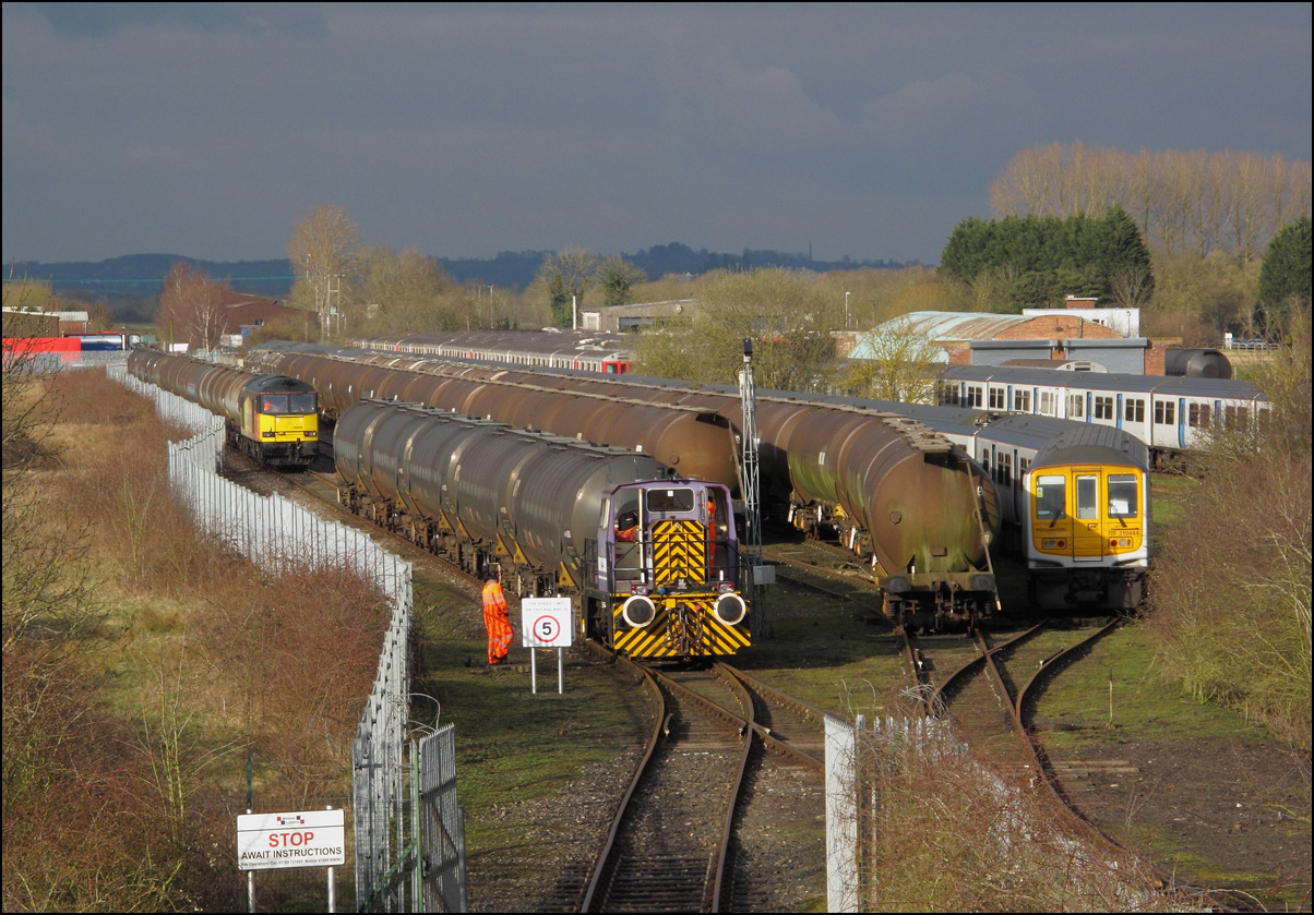 Yet another brand new class 701 EMU was taken for storage from Eastleigh to Long Marston on 8 May 2024. I think this was the third attempt to run this particular 5Q90 and even then it ran about an hour late all the way to Worcester TC. Making a change from the previous trains using class 47 power was the use of clean and shiny 69011 which although not the first to visit the Warwickshire site was more than enough to tempt me out. The sun came out as I drove towards Evesham making me change my original destination and head to Evesham station where I fancied a shot from the footbridge rather the usual roadbridge overlooking the signalbox. I don't recall or really care how many class 701s are stored at Long Marston but there are loads of them all over the site some of which can be seen in the background of this shot of 15043 moving a fuel tank around the loop a couple of weeks ago. |