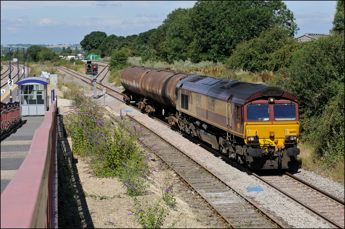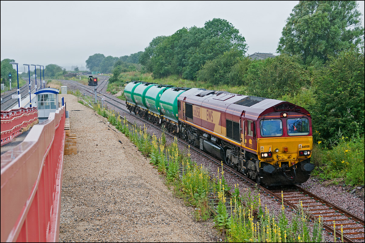 The single wagon was soon attached to 66084 at Long Marston on 24 June 2024 and 6Z24 left the yard about 35 minutes early in a tiny bit of brightness. It didn't get far and had to wait for its booked path at Honeybourne before going on to Warrington Arpley via Worcester and Birmingham. |