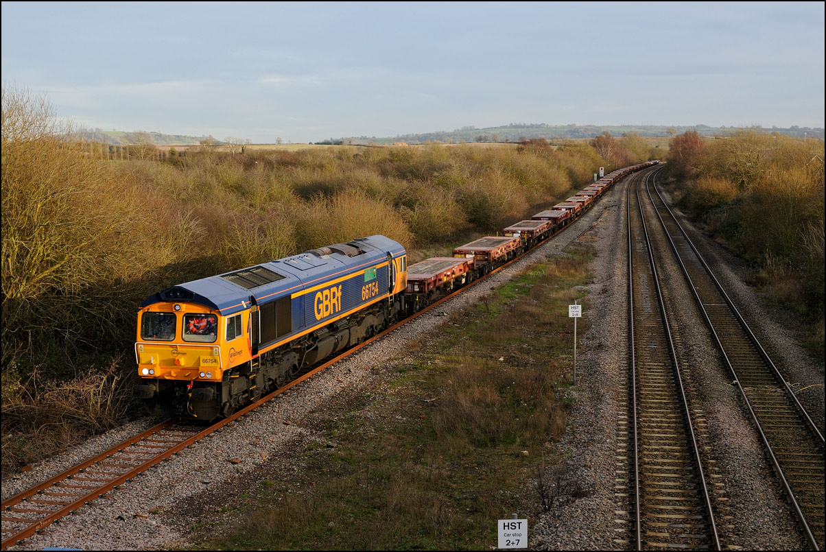 The second train to Long Marston on 25 November 2025 looked at one time not to be running. It was a 6V52 from Wembley taking new GBRf box wagons for temporary storage but when it reached 230 minutes late a "Cancelled" note appeared on RTT. A bit later it moved, now as 4V52 with 47739 in charge. Some time was made up as it approached and went around Birmingham and with a 60 minute layover at Worcester Shrub Hill not used it was exactly 120 minutes late leaving Norton Junction. This consist made a very welcome change for me from various repetitive units so I went to Honeybourne where, given an almost total lack of daylight, it was handy that the train would be moving very slowly. It was a pain that a bright sky appeared in the left background at just the wrong moment but still worth but it worked out reasonably well in the end. |