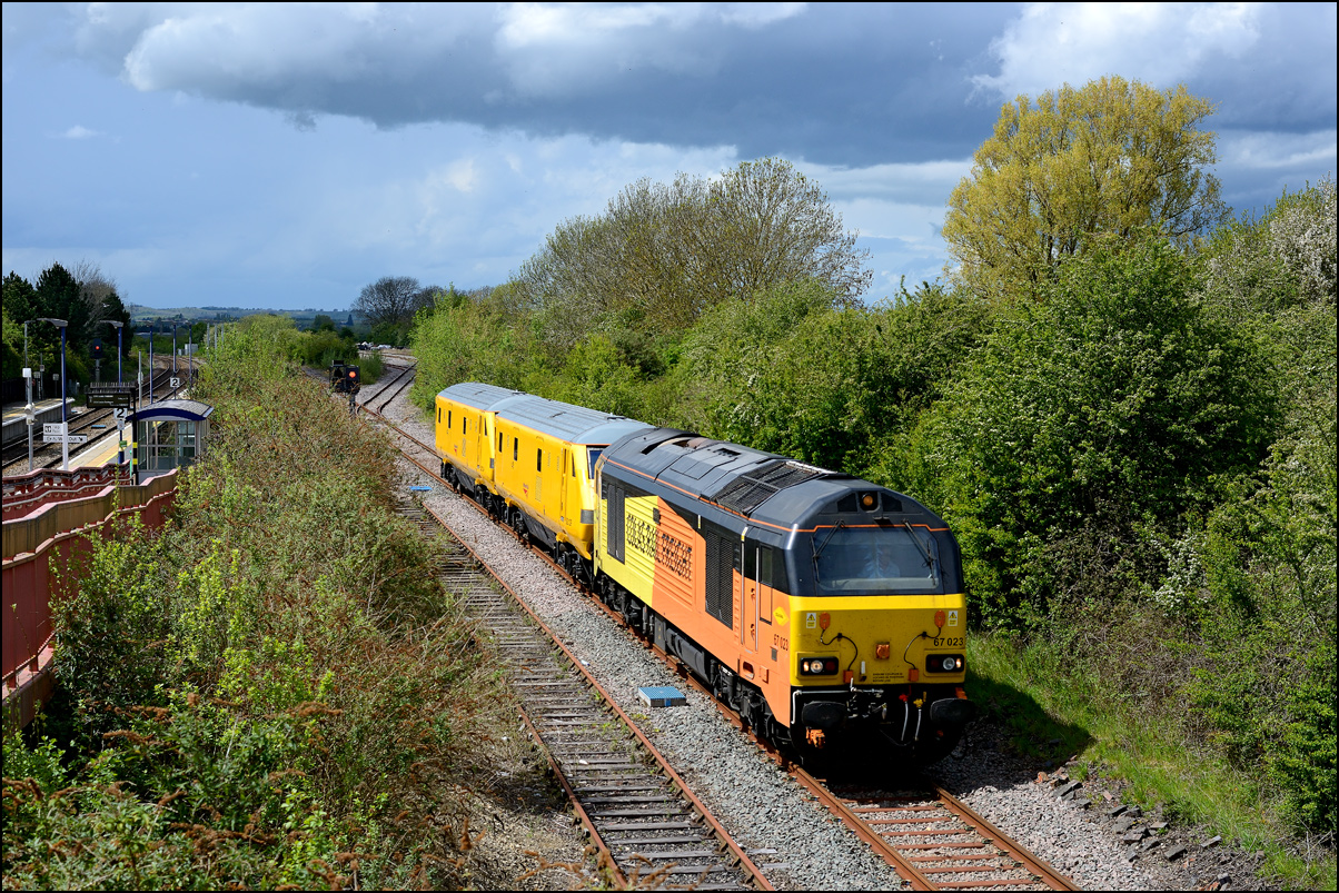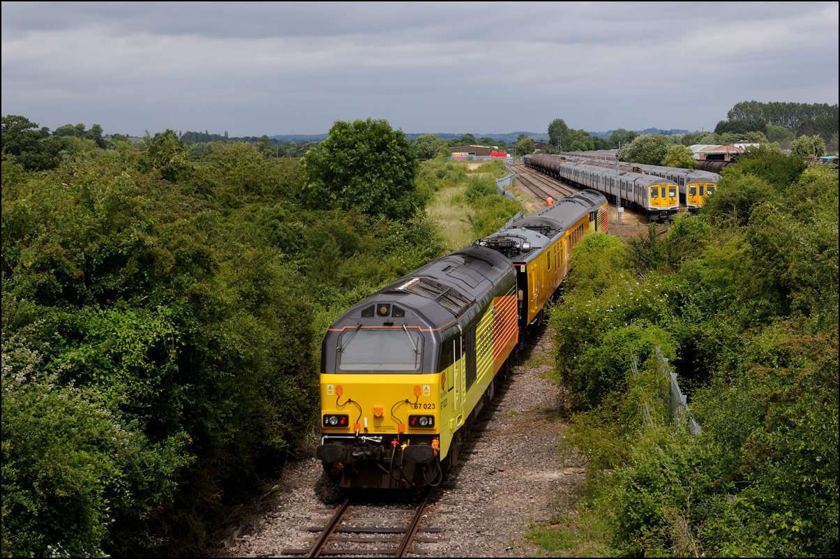 Rail Operation Group's brand new tri-mode 93001 was taken from Worksop Down Yard to Long Marston on 17 June 2024 ready for it to be displayed at the annual Rail Live event. The move was interesting not only because the class 93 was a new locomotive for the North Cotswold Line and the Long Marston branch but also because a locomotive almost exactly 63 years old was used to transport it. I wanted a shot of the green pair at Long Marston itself which made the arrival photograph on a sunny day a bit challenging given the sun's angle. I wasn't too bothered about this having taken a decent shot of a couple of days earlier which took away any pressure. Once again the green background does its best to hide 0Q67 arriving close to right time. |