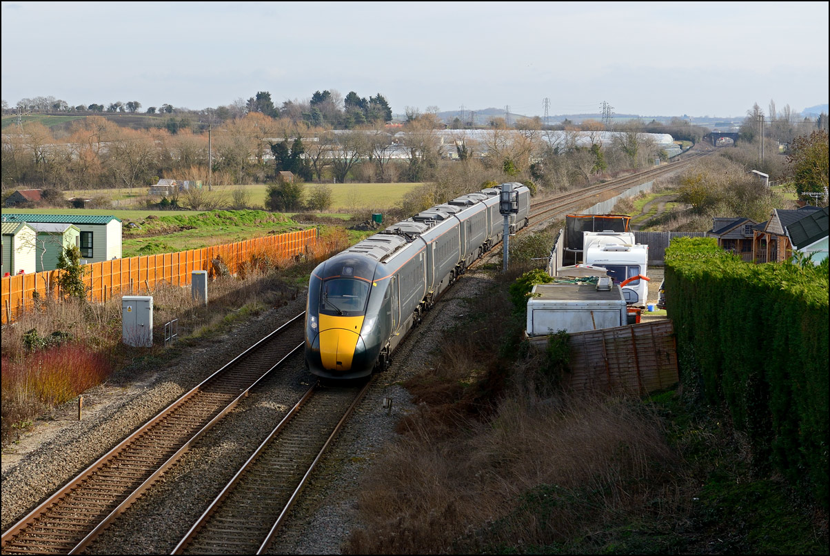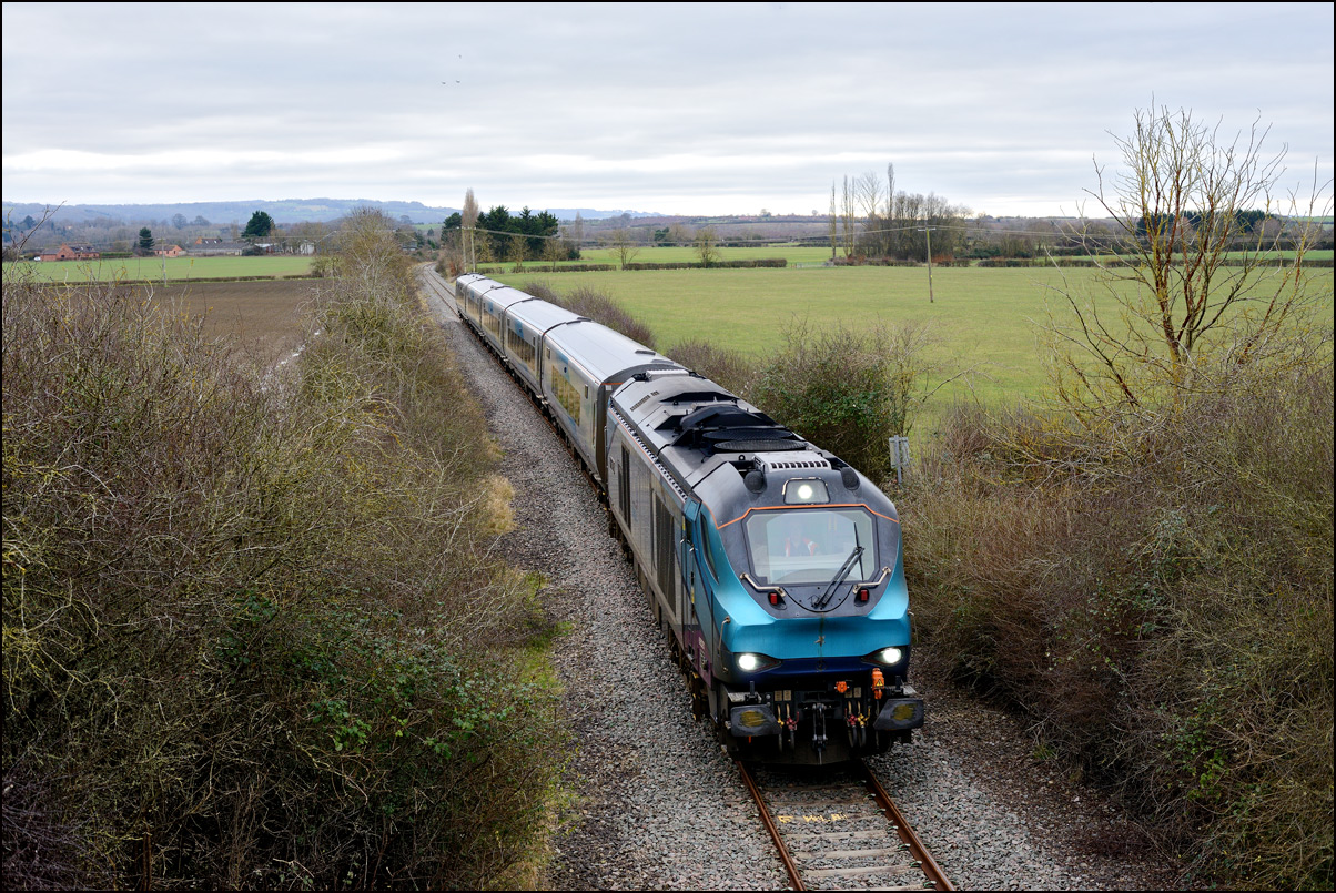 I had watched two Great Western trains pass Wyre Piddle on 5 March 2025 and hoped that 69012 with 701002 was at Evesham ready for when 800027 cleared the single track to Norton Junction. Despite the locomotive having been about 45 minutes late arriving light engine at Long Marston earlier RTT soon showed that it was away from Evesham about on time. It didn't take long for it to appear in the distance and the well-turned out 69012 in a representation of the livery once carried by Falcon passed by in some bright sunshine. I took a short video clip on my phone and the locomotive's horn can be heard at the end as it approached one of several farm crossings on this section. |