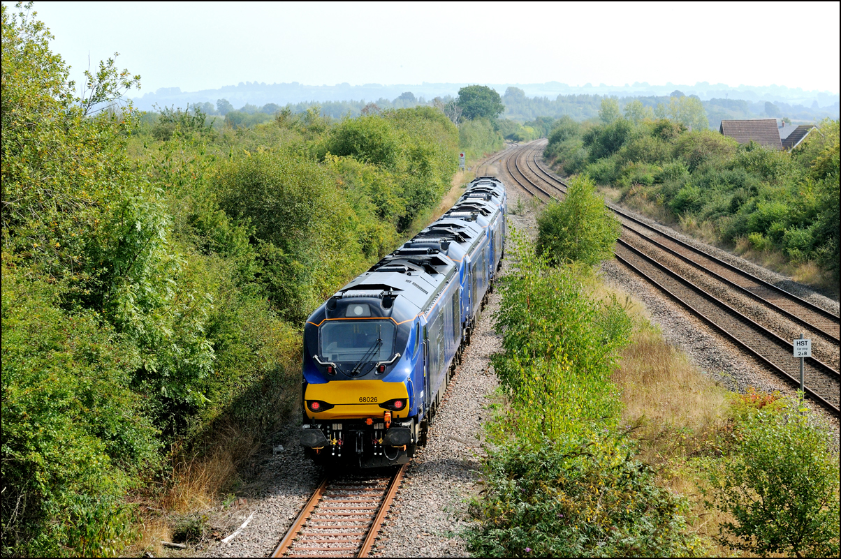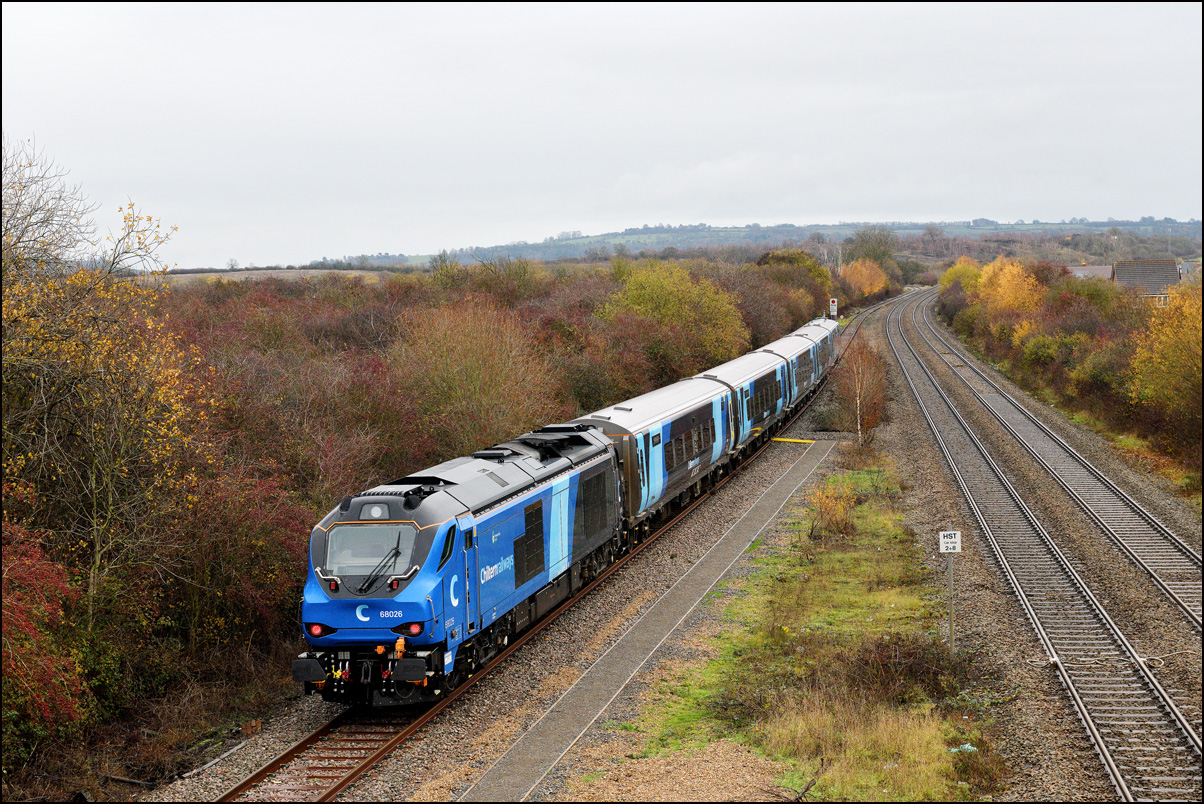 I've not been taking many railway photographs of late preferring the challenges of bird and other wildlife photography. On Thursday 4 December 2025 though I decided at the last minute to go for the latest class 68 and Chiltern set runnng from Eastleigh to Long Marston, particularly as 5Q67 was routed along the North Cotswold Line rather than the much more circuitous route via Hatton, Birmingham and Worcester, I reached Honeybourne about 2 minutes before 68026 appeared in the far background about 6 minutes early and passing some autumnal colours and without any sun around which would have made a lot of shots in the area hopeless because of long shadows. This are the first class 68 and stock I've seen in the new Chiltern colour scheme and coincidentally was the first of its class to work a train out of Long Marston which it did on 3 August 2020. |