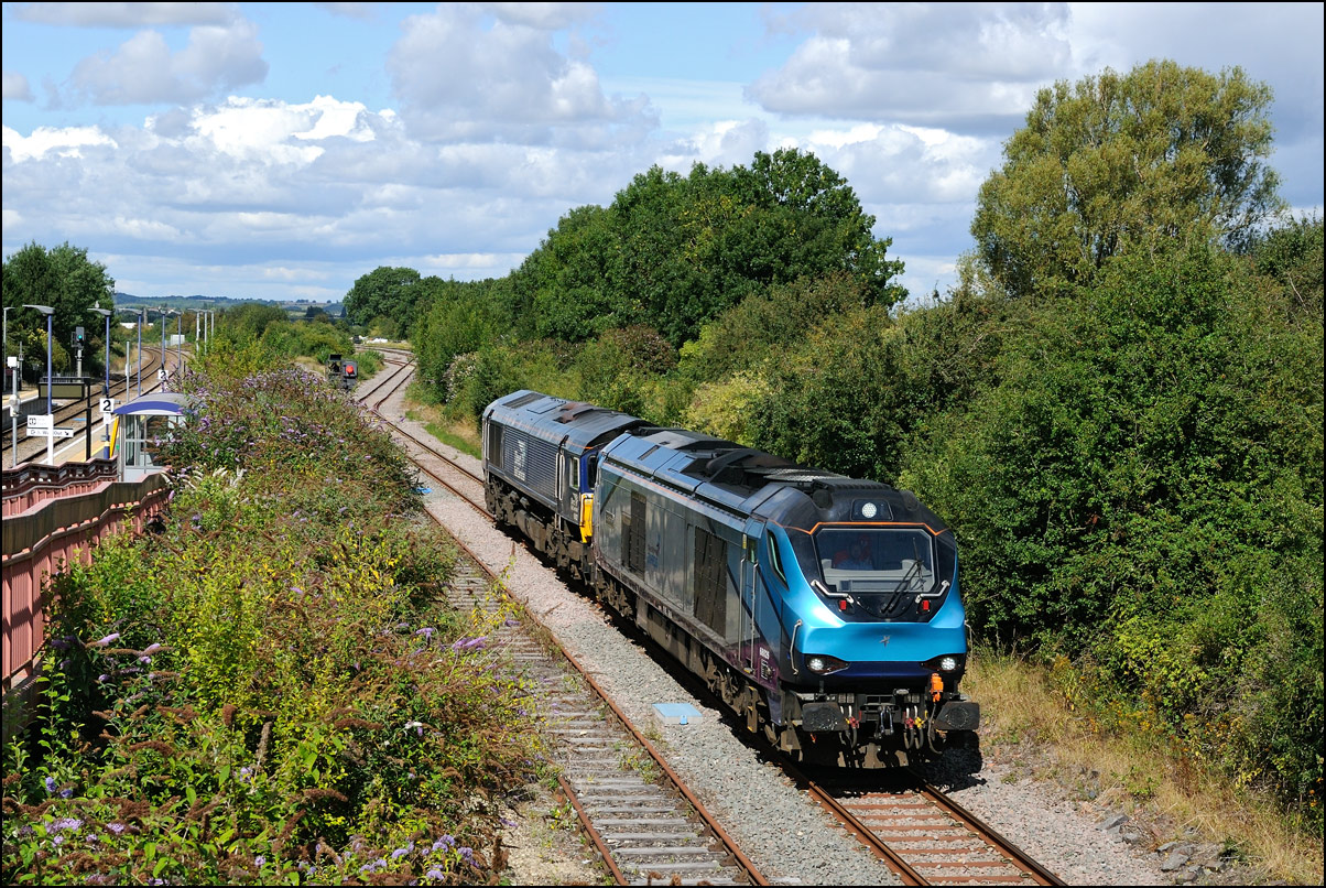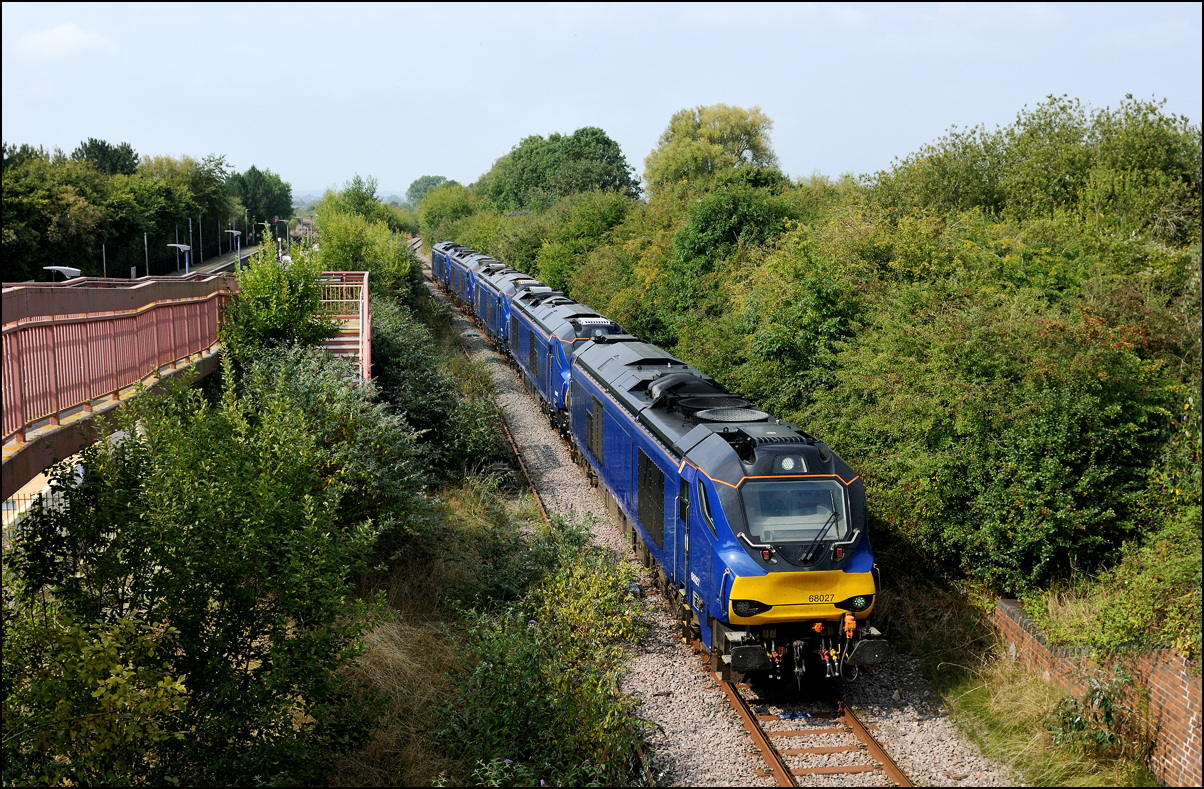 The second batch of 5 redundant class 68s formerly operated by Trans-Pennine went for storage at Long Marston on Friday 6 September 2024. The first 5 had gone in the previous day but I wasn't able to go for it and anyway, the weather was very dull and a train of plain blue locomotives needs some sun to make the image worth the effort. After a couple of cancellations and one reinstatement 0Z90 formed of 68027, 68020, 68022, 68031 and 68026 left Crewe 22 minutes late and gradually became later througout the journey. The sun came out in Stratford-upon-Avon about 45 minutes before the cavalcade was due at Evesham but having taken a lot of shots there recently I went instead to Honeybourne guessing that the view from the roadbridge would just about be shadow-free. It was and within about 2 minutes of my arrival 0Z90 joined the Long Marston branch some 62 minutes late, the leading locomotive making a stark contrast to how it looked in August 2024. I took a second shot mostly to show the dreadful state of the undergrowth near the branch. The whole railway appears to be going mad if judged only by the amount of perfectly decent and even brand new stock festering in open storage at Long Marston and other sites around the country. |
