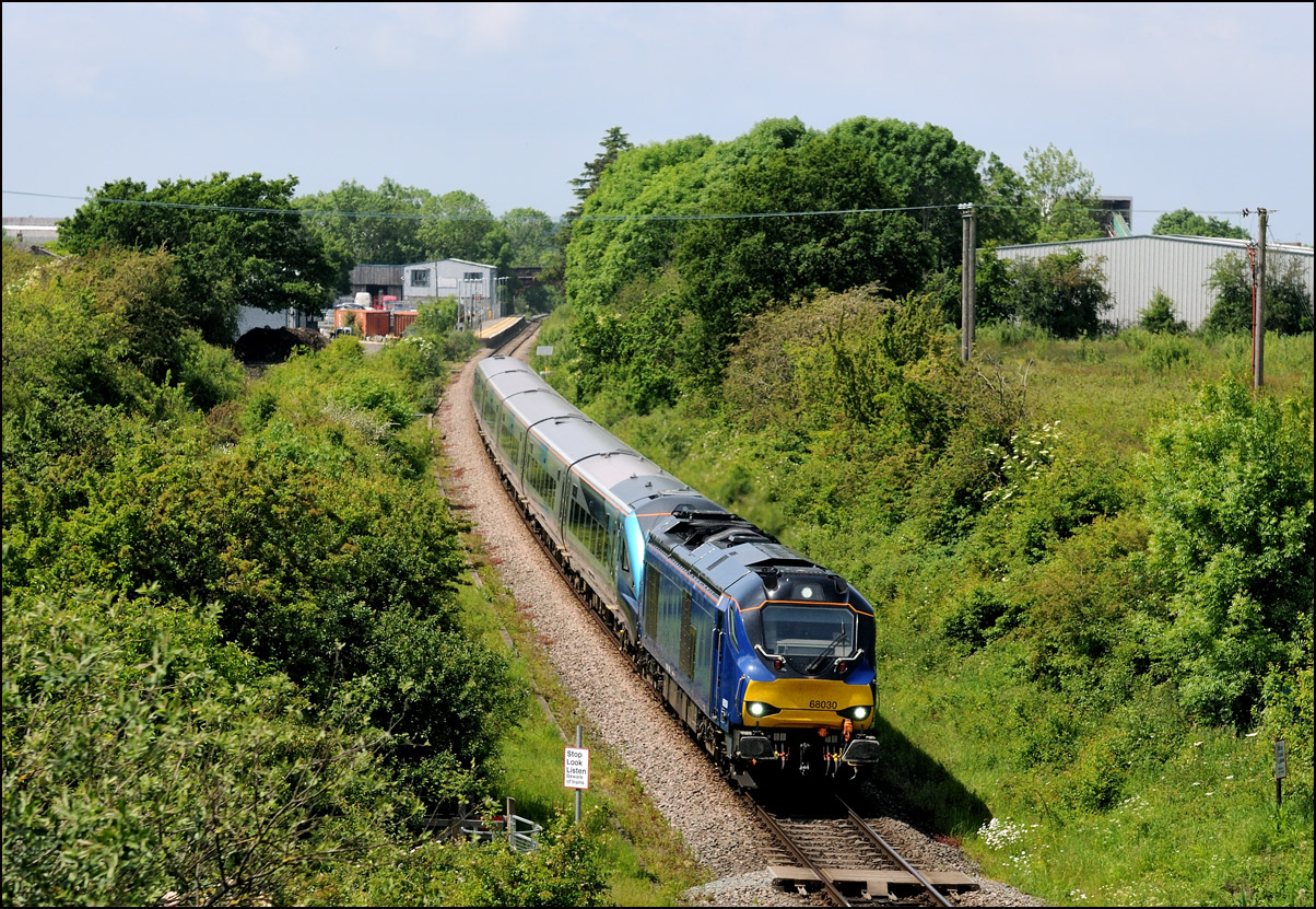 Another set of TPE stock was due to be taken from Longsight Depot to Long Marston for storage on Monday 20 May 2024. It initially appeared to be cancelled but eventually left 33 minutes late and gradually picked up time throughout its journey. Despite a sunny forecast the morning was dull and cloudy but when it began to brighten I headed over towards Pershore and was lucky that the sun found a big clear patch of sky just after RTT showed that 68030 in a plain blue colour scheme with TPE set 10 passed Norton Junction about 1 minute early. This location will soon disappear as unchecked lineside vegetation takes over to join many other spots as little more than a green corridor. |
