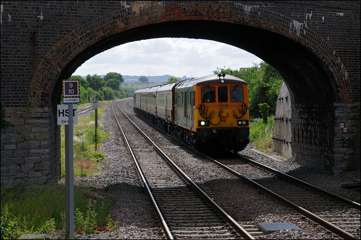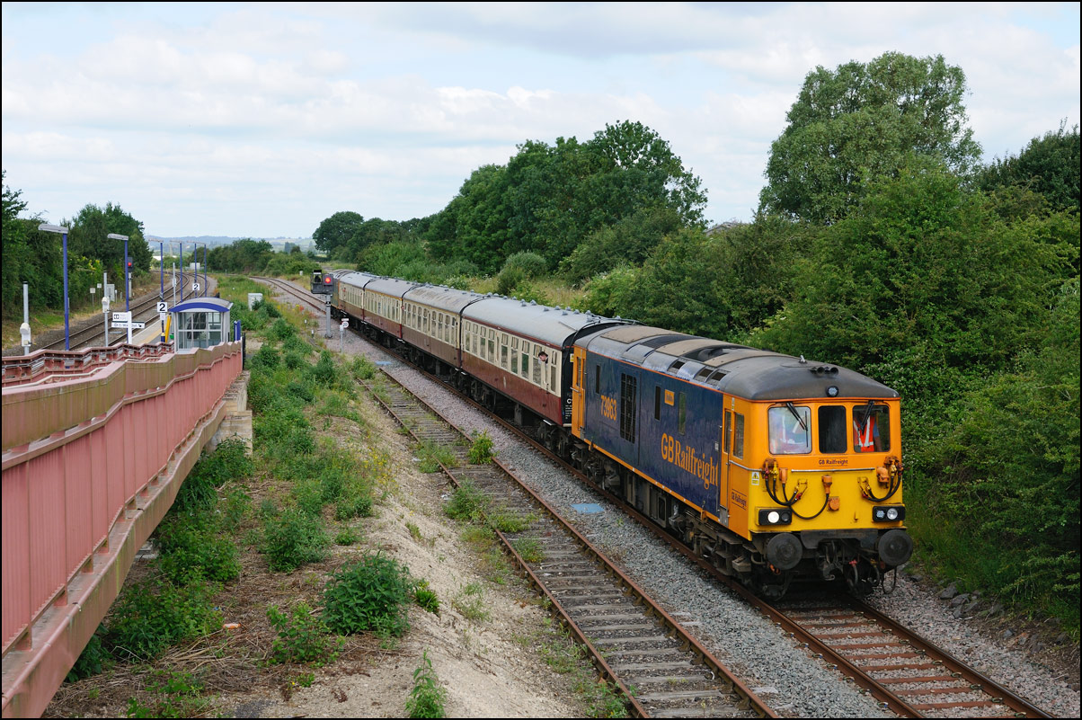The pair of class 33s on the rear of the train are the only Cromptons I have seen on the branch and despite the large number of enthusiasts on the bridge, I managed to squeeze in to get this shot. It had to be heavily cropped to remove an elbow! The exhaust from 47348 came be seen in the middle distance as it accelerates the train up the speed limit for the branch, 20mph. |