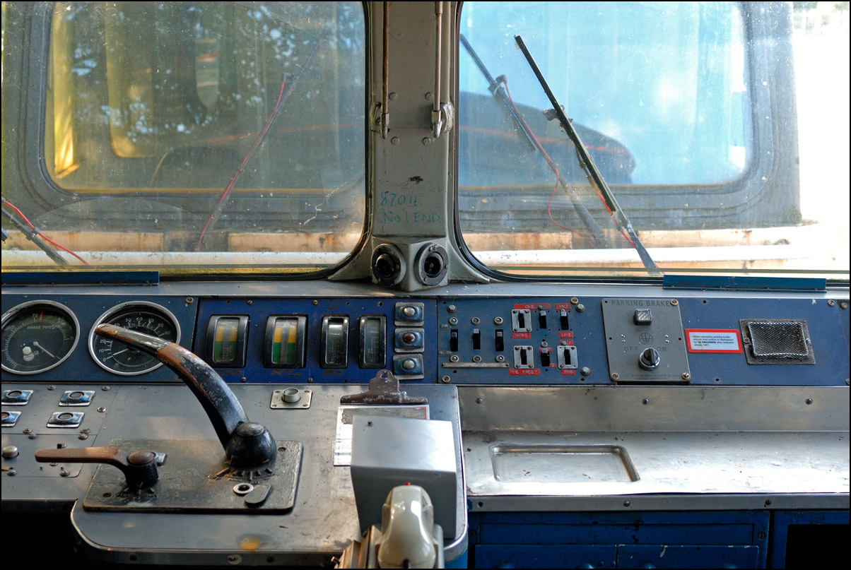 One of the cab doors on 87011 was opened on 16 September 2006 and we climbed aboard for a look. I didn't have a wide angle lens in my camera bag so this is the best view achievable. The locomotive battery still had some charge and it was interesting to switch on the systems and hear various bits of equipment clicking and whirring. |