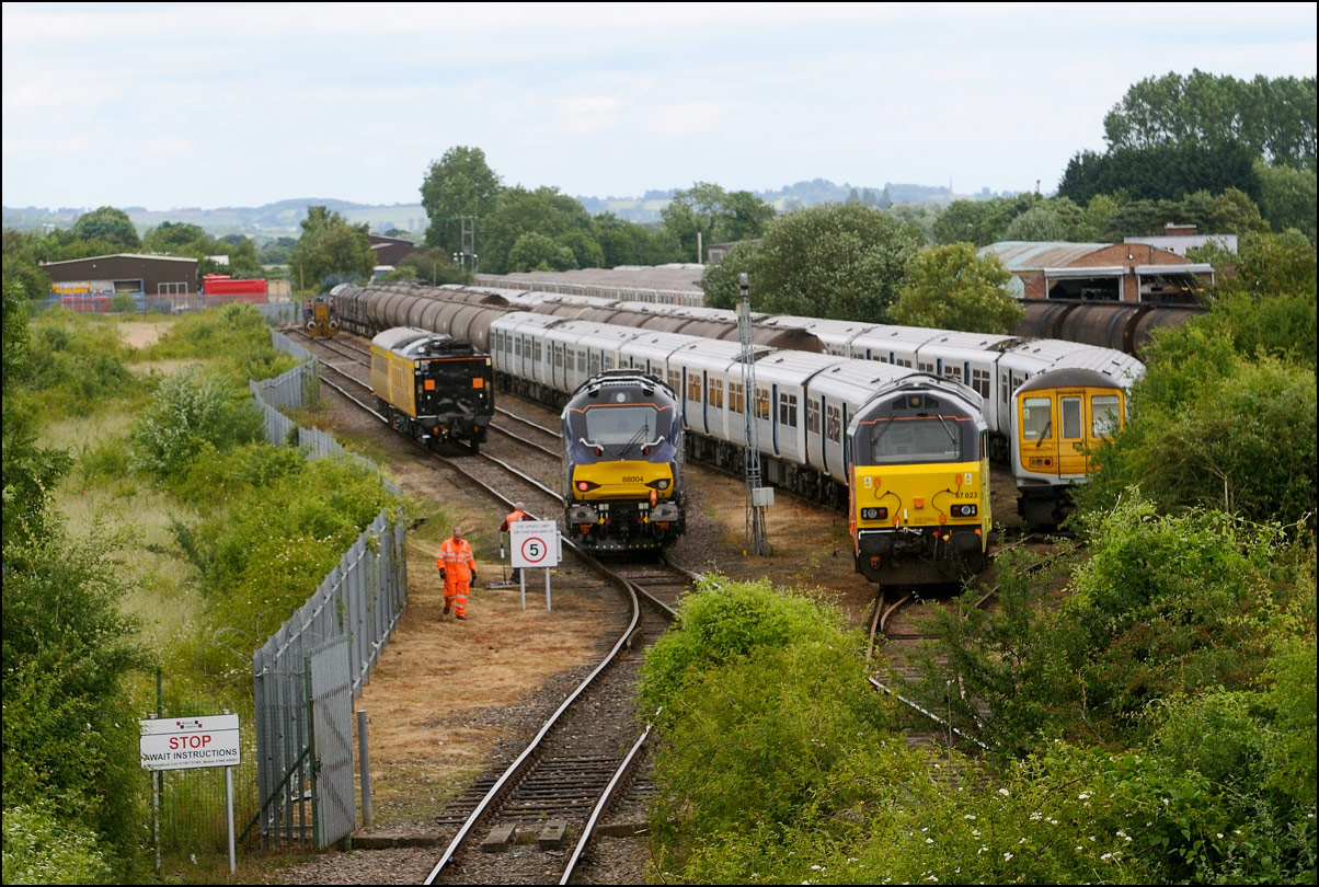 A class 458 EMU was taken for storage at Long Marston from Wimbledon CSD on Wednesday 6 August 2025. The unit, 458536, was sandwiched between ROG barrier/translator wagons with topped and tailed 37611 + 37608 providing the power; the train running running as 7Q94 being routed via Oxford and the North Cotswold Line. at Honeybourne it reversed at the North Junctioin before heading along the Long Marston branch behind the station. Some vegetation clearance has taken place although clearly not enough but there was a better view of more of the train than a few months previously. |