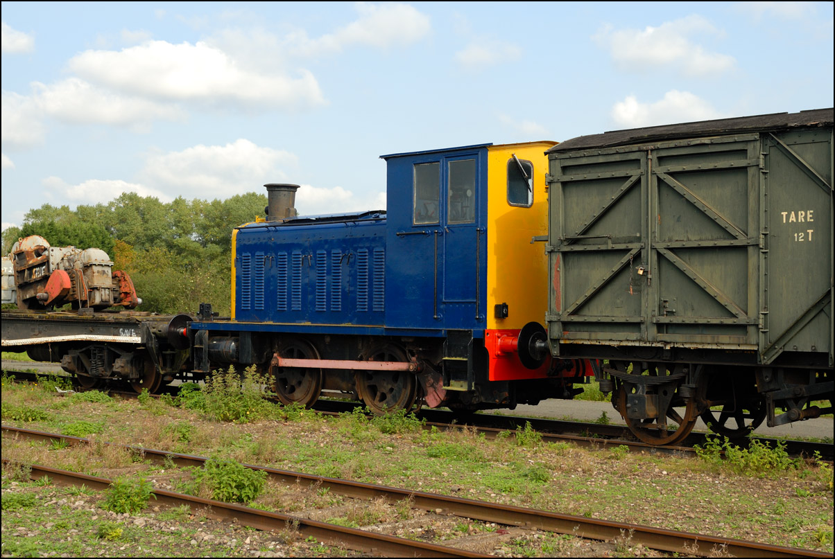 The Stratford and Broadway Railway Society leased part of the Long Marston site and on Sunday 23 October 2005 held an open day. Sadly, and after a lot work by the members refurbishing coaching stock, the planned rides around the depot's circuit were not available following the failure of the diesel shunter diagrammed for the task. Visitors therefore had to be content with examing some of the locomotives and stock on view. This image shows a Baguley-Drewry 0-4-0 diesel locomotive standing at the head of an attractive set of MOD wagons. |