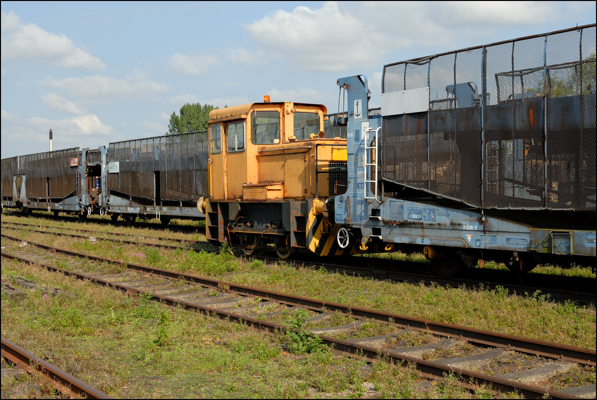 In addition to the main line locomotives at Long Marston there were quite a number of privately owned industrial engines. Here is an 0-4-0 example looking a bit dwarfed against a rake of double-decked car-carrying wagons. |