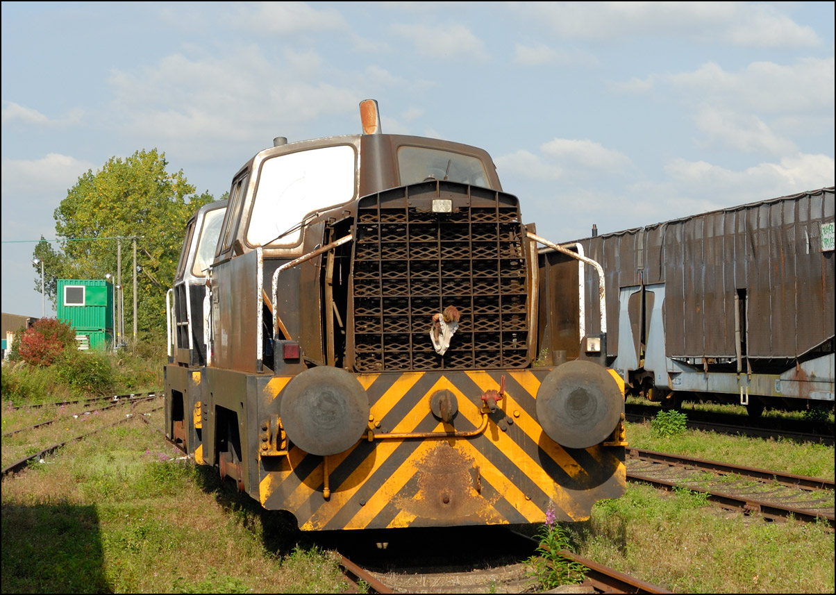 Here is an ex-MOD Sentinel standing in a headshunt near to the main loco sheds. It is in front of a rake of former Tiphook box wagons, the true size of which are only really apparent when one is at track level near to them. They are huge! |