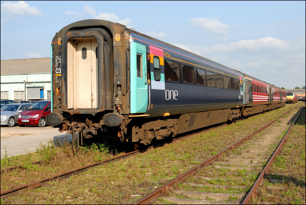 Although the majority of the stock stored in Long Marston came from Virgin Trains there were a few examples from elsewhere. Here is a First Class Mk3 with ONE branding standing with some others from VT with some DVTs in the background. |