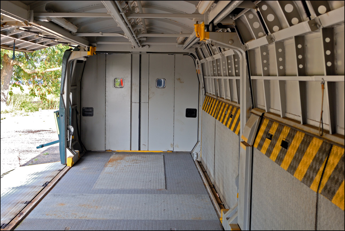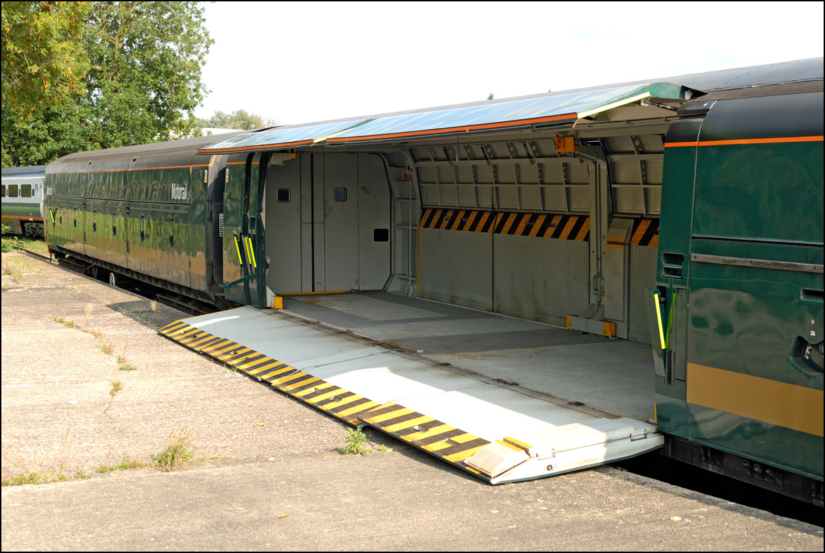 A set of 6 Motorail vans were at Long Marston on 16 September 2006 and Mark Honey wound down the access doors on one of them to allow a view of the inside along a view taken along with another taken from one end of the vehicle. These vans were in and out of Long Marston for some time and here is a view of them at Evesham behind 47145 and near Lower Moor and again at Croome Perry being hauled by 47727. |