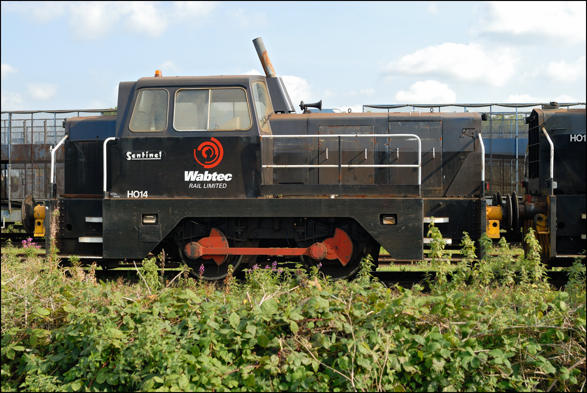 Another Sentinel, H021, this time in the attractive black colour scheme of Wabtec, is seen just outside the shed partly obscuring a Harry Needle 0-6-0 shunter. |