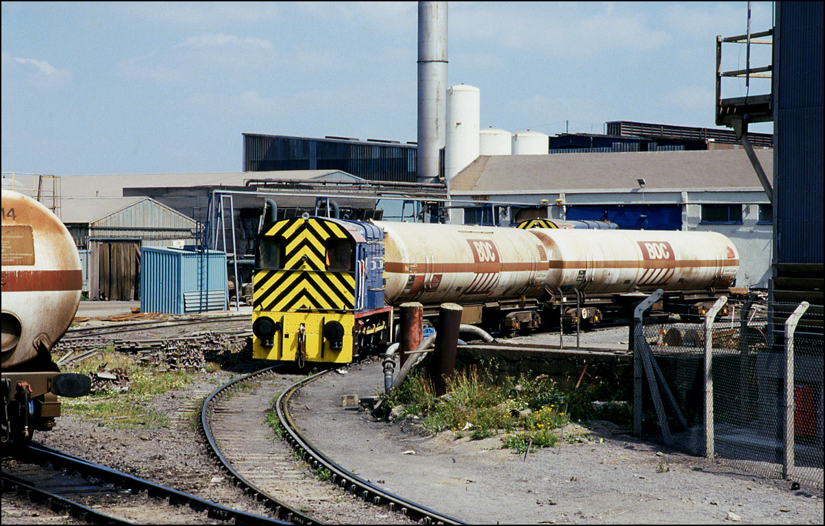 Another pressure tanks was attached to the first vehicle and 08216 soon brought them both forward to make up the train ready for a main line locomotive to take out of BOC Sheerness on 16 August 1991.