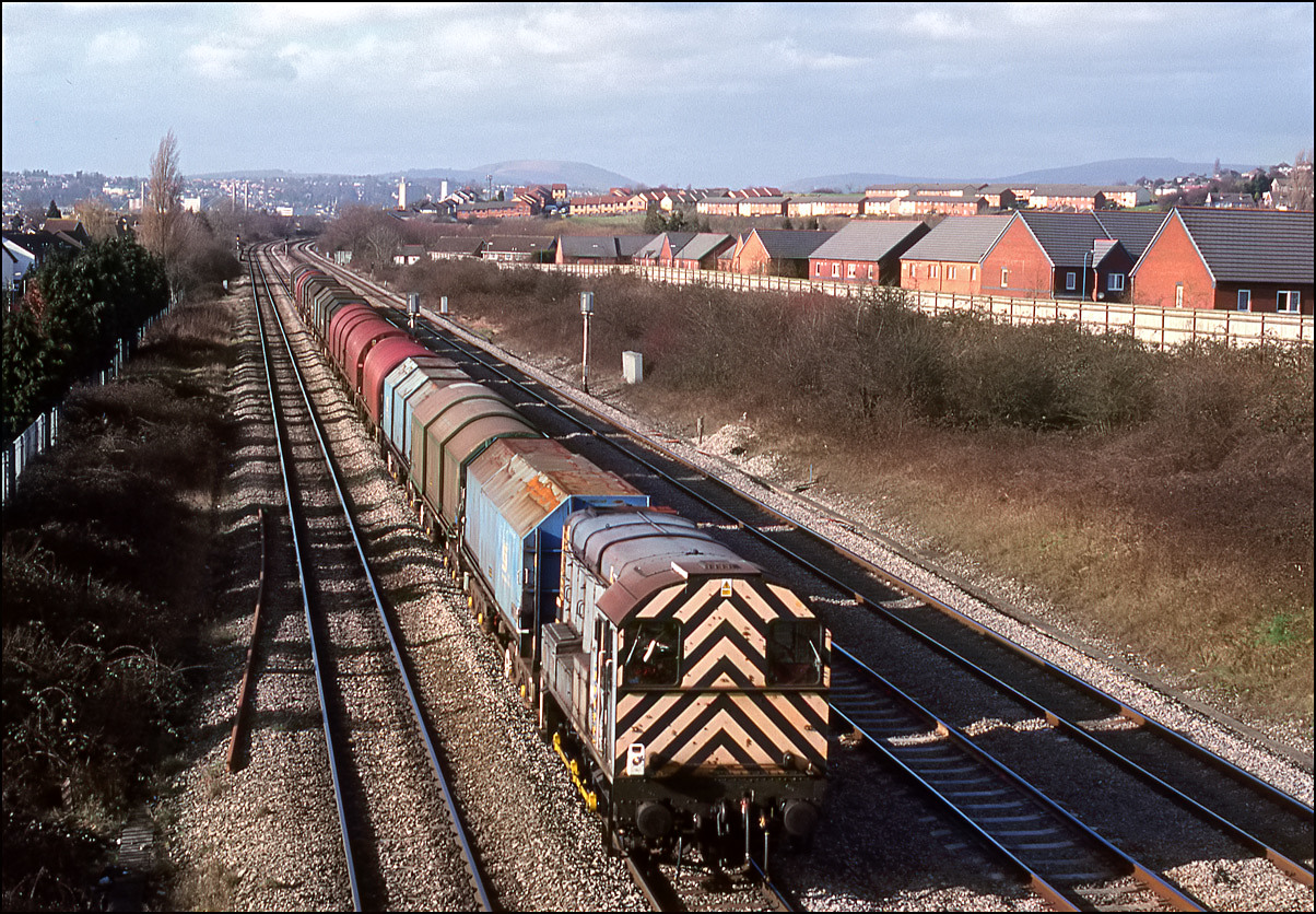 bringing the loaded wagons up the bank towards Gillingham Yard. The exhaust haze produced by the loocmotive can been seen which emphasised