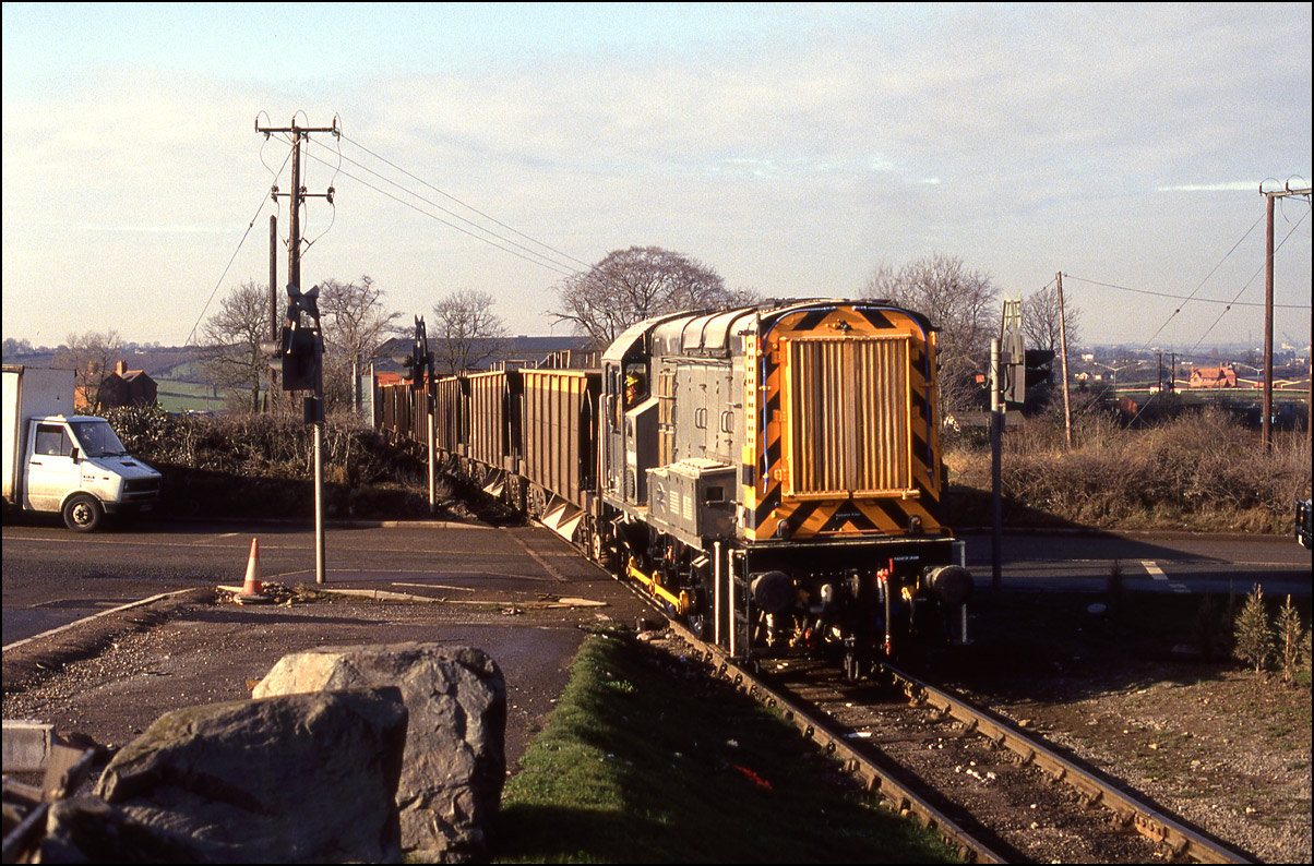 A class 09 was also based at Stud Farm quarry in Leicestershire which I was lucky enough to happen upon on 11 March 1993. This picture shows it crossing the road with a train
