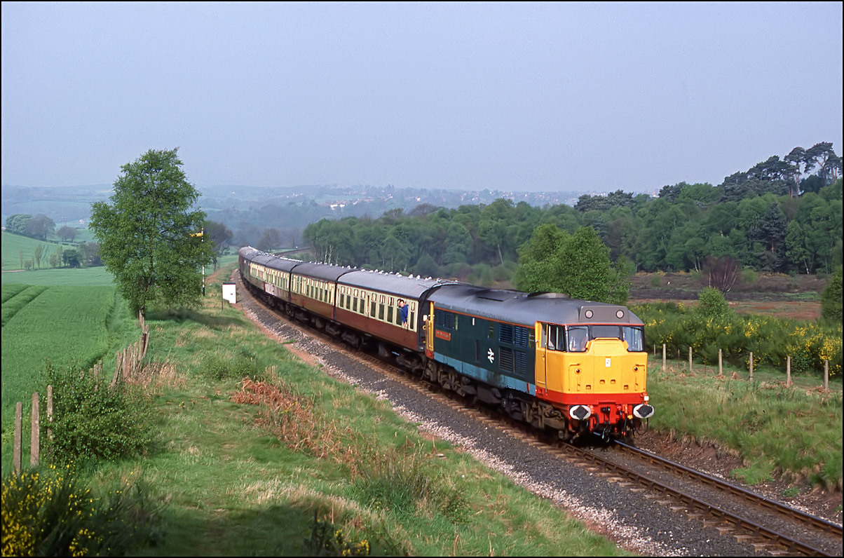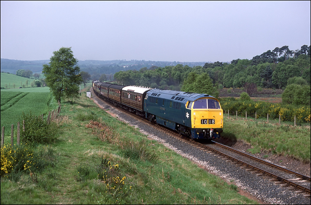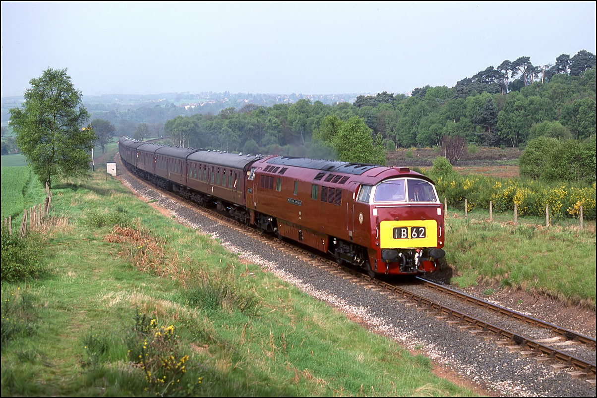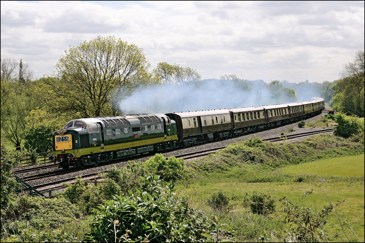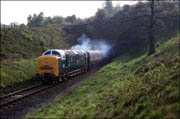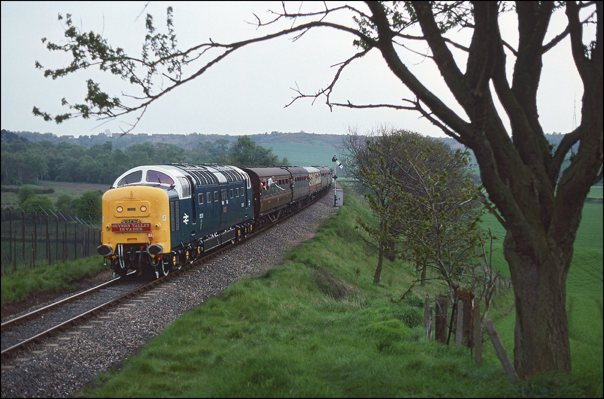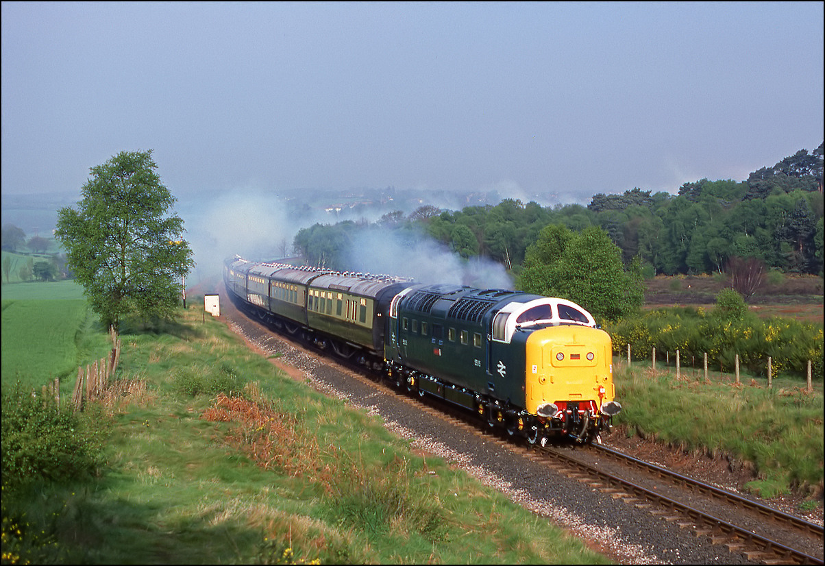 Here is a much earlier shot of a Deltic, in fact it was the first mainline run of a class member in the preservation era. 55001 is seen some 9 minutes late leaving the wood at Croome Perry on 18 April 1997 with 1Z56, the 11.30 London Euston to London Paddington via Birmingham and Bristol Temple Meads. I have never seen so many photographers