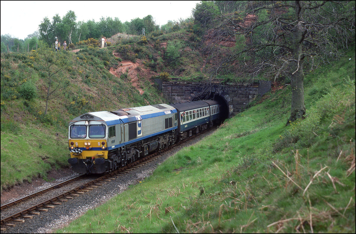 After seeing 59001 at Kidderminster some of us on the footbridge went, trackside permits in hand, to the cutting near the portal of Bewdley Tunnel which was the ideal spot for the first trains of the day, 7 May 1988. First
