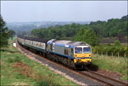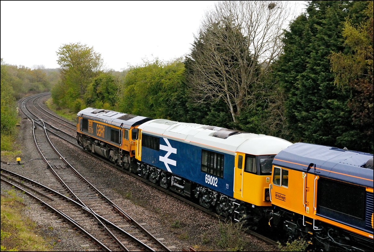 Honeybourne area when 69002 suffered fuel supply problems and it was fortunate that 69001 was able to take 1Z35 forward. A third locomotive, GBRf 66765 was on the back of the formation