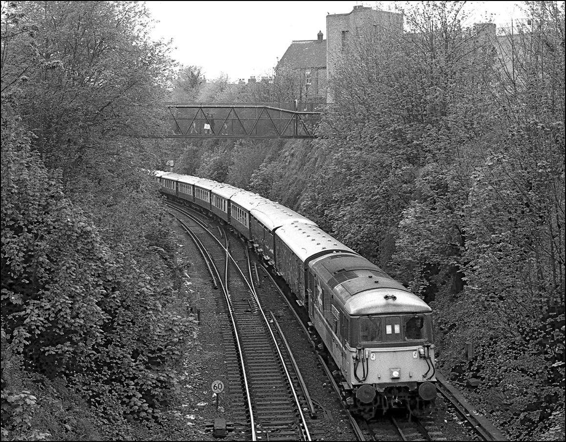 belching out its smelly exhaust. Here is a view of rail blue 55019 as the pair recede from the footbridge.