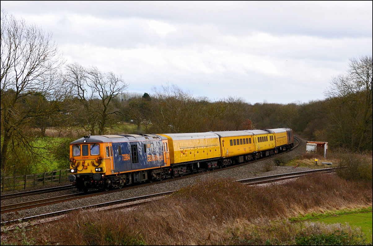 While waiting for 5Q95 on the road bridge at Honeybourne on Saturday 24 February 2018 I was told that a pair of class 73/9s was topping and tailing a 1Q69