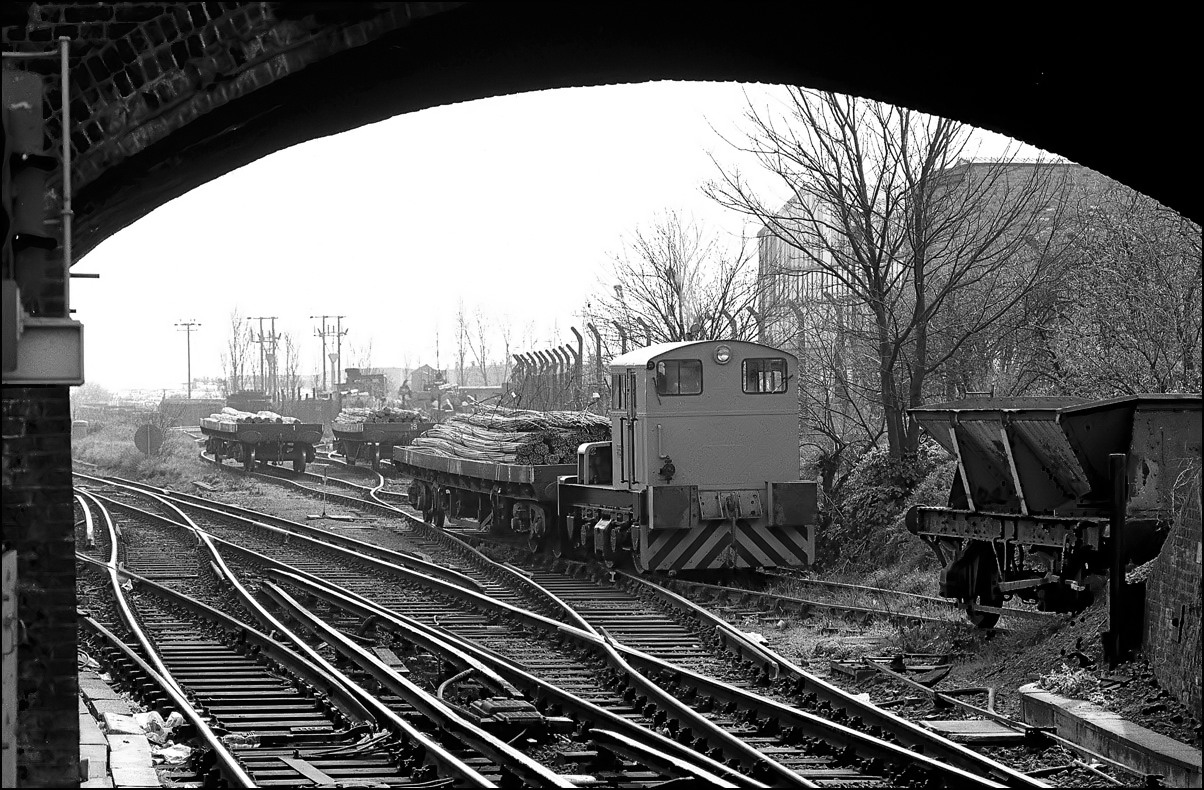 In contrast to the shot above the light couldn't have been better when 08600 came in the opposite with a long rake of bogie scrap-carrying box wagons. It's a mystery to me why I didn't take a colour transparency