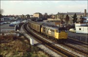 11.15. One of highlights of the day for me was the appearance of the Angerstein Wharf to Paddington Yard aggregate train. This was a solid class 33 turn at the time and it was good to get a pair on a heavy train on the then Western Region. 33021+33047 are seen here applying the power to get their train moving onto the Greenford Loop, from where they will turn right, head past Park Royal and enter their destination for unloading. 645 |
