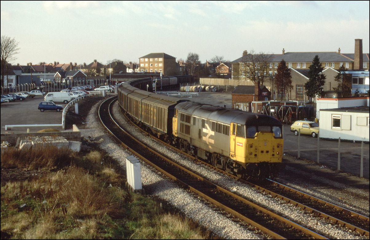 11.02. The frequency of traffic had really begun to pick up by now, as the rush hour embargo on freight receded. This is 37893 on the morning Micheldever to Ripple Lane empty oils tanks passing the Plasser & Theurer factory as an up HST screams by at high speed on the up main. |
