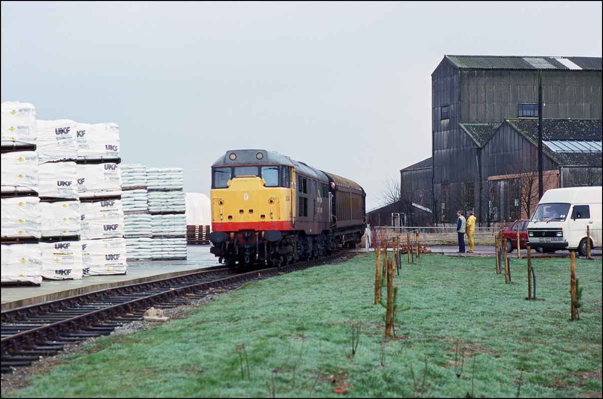 wagons out of the headshunt. On this occasion, 11 November 1989, the load was not palletised and the bags of fertiliser were individually lifted out by forklift truck.
