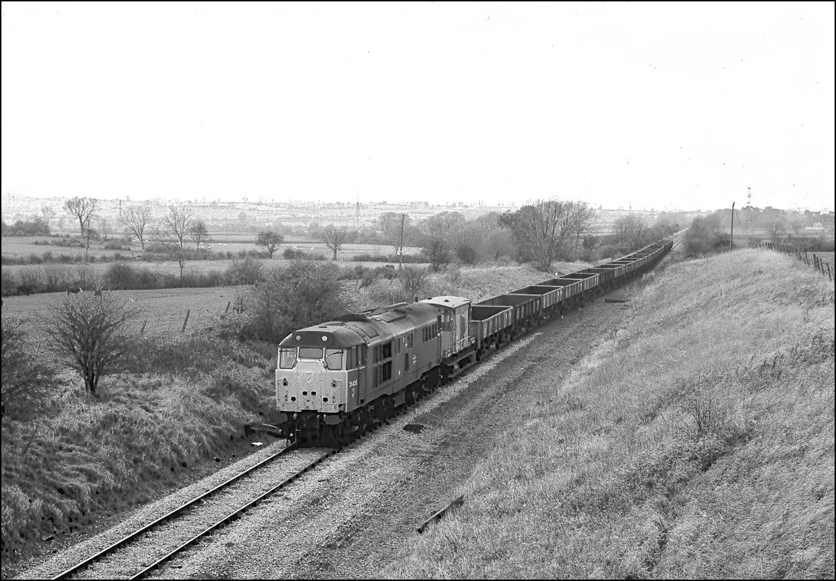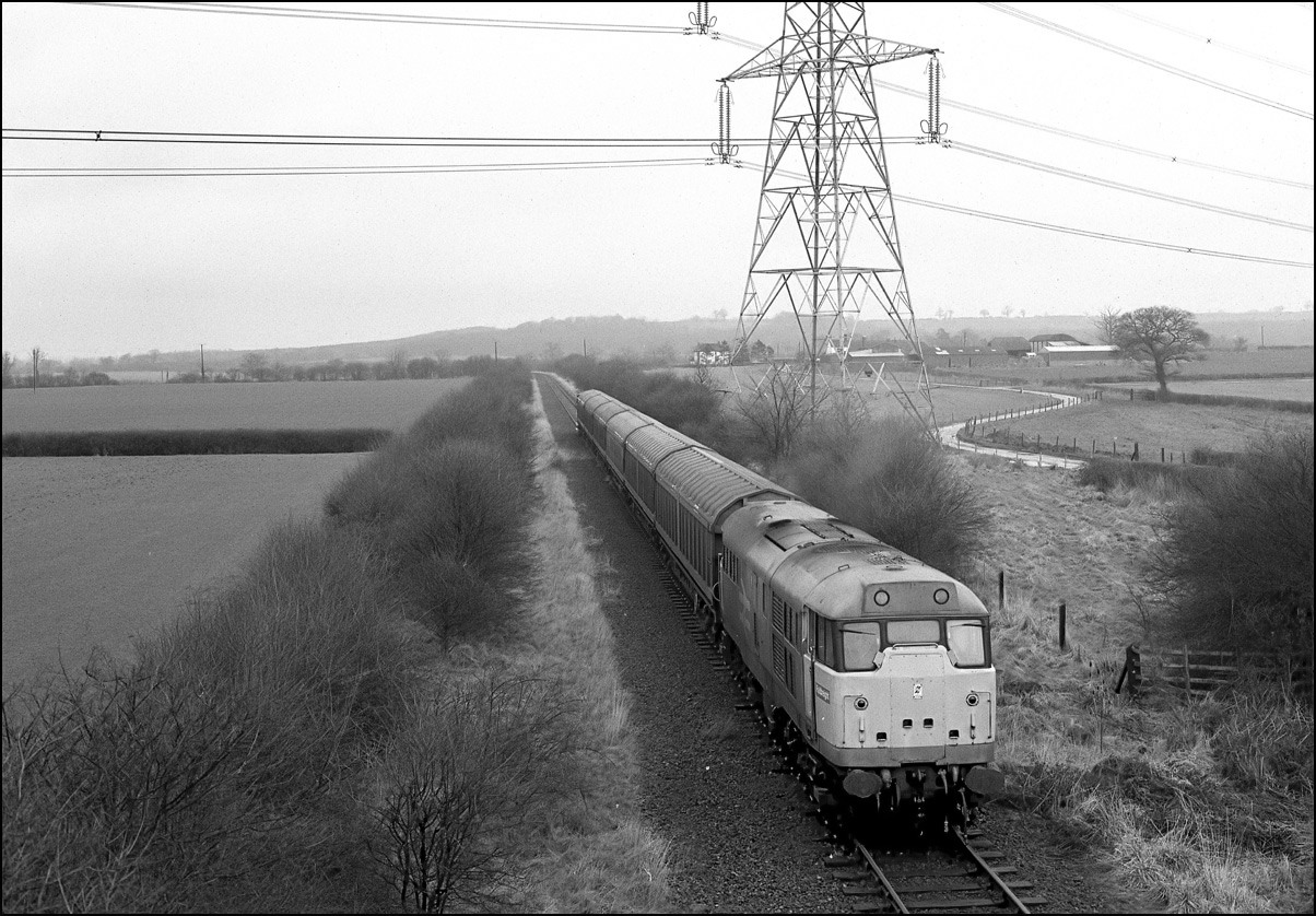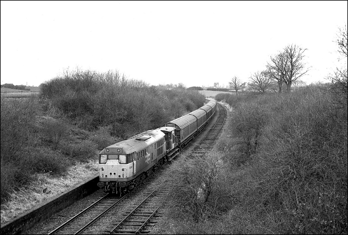 4 March 1989, 31247 is heading north on the former southbound tracks with the empties from Akeman Street. It was a feature of this line that the best parts of either line were used when the route was singled and there are several instances of track slewing to demonstrate how this was done.